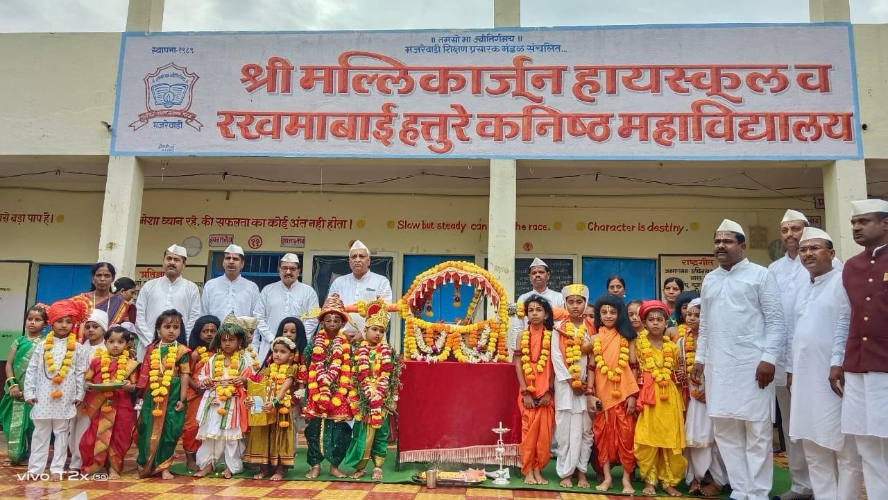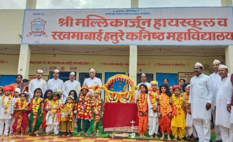सोलापूर जिल्हा प्रतिनिधी / नागनाथ पाटील : मजरेवाडी शिक्षण प्रसारक मंडळ संचलित,श्री मल्लिकार्जुन बालक मंदिर,श्री सिद्रामप्पा हत्तुरे प्राथमिक शाळा,श्री मल्लिकार्जुन हायस्कूल व रखमाबाई हत्तुरे कनिष्ठ महाविद्यालय,हत्तुरे नगर यांच्या संयुक्त विद्यमाने आषाढी वारी निमित्त विद्यार्थी बाल दिंडीचे आयोजन भक्तिमय वातावरणात करण्यात आले होते. प्रारंभी प्राचार्य वैजिनाथ हत्तुरे, संस्थेचे अध्यक्ष सिद्धप्पा वरनाळ, धरेप्पा हत्तुरे व प्राथमिकचे मुख्याध्यापक सचिन जाधव व पर्यवेक्षक रमेश दिंडोरे यांच्या शुभहस्ते पालखीचे पूजन करुन दिंडी मार्गस्थ झाली.