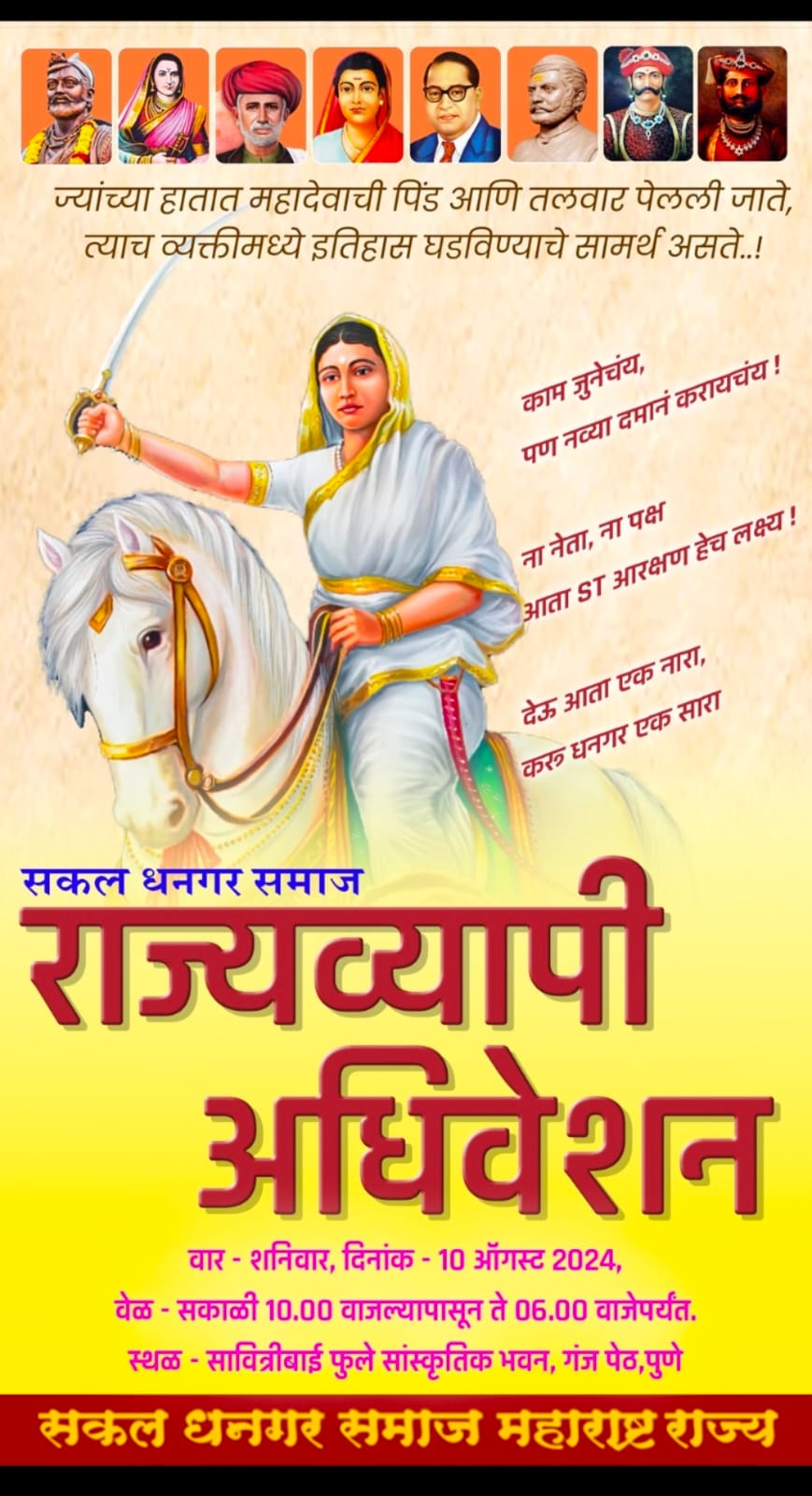 पुणे प्रतिनिधी / भारत कवितके : शनिवार दिनांक १० आगस्ट २०२४ रोजी सकाळी १० ते सायंकाळी ६ वाजेपर्यंत पुणे येथे सकल धनगर समाजाच्या राज्य व्यापी अधिवेशनाचे आयोजन करण्यात आले असल्याचे सकल धनगर समाज महाराष्ट्र राज्य, यांच्या वतीने जाहीर करण्यात आले आहे.पुणे येथील सावित्रीबाई फुले सांस्कृतीक भवन, गंज पेठ पुणे या ठिकाणी ” एकच नारा, धनगर सारा”,” लढा एसटी प्रमाण पत्र मिळेपर्यंत” ,” ना नेता,ना पक्ष आता एसटी आरक्षण हेच लक्ष” ,” देऊ आता एक नारा,करु धनगर एक सारा” ,” काम जुने च पण नव्या दमाने करायचे”, आदी गोष्टी वर विचार विनिमय करून पुढचे ठोस पाऊल उचलण्यासाठी सकल धनगर समाज राज्य व्यापी अधिवेशन भरविते आहे.