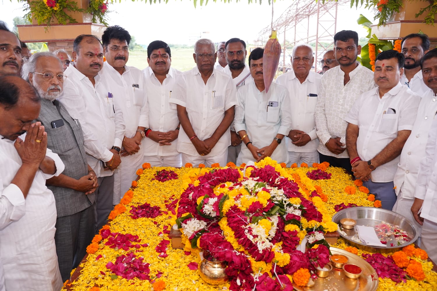 नांदेड जिल्हा प्रतिनिधी / मिलींद बच्छाव : लोकनेते कै.बळवंतरावजी पाटील चव्हाण यांच्या १७ व्या पुण्यस्मरण, निमीत्त पुष्पाजंली कार्यक्रम हनुमान मंदिर जुने गाव नायगांव बाजार येथे बुधवार दि.७ ऑगस्ट रोजी सकाळी १०.वा.घेण्यात आला.या निमित्त त्यांचे सर्व नातवंडं यांच्या हस्ते विधीवृत पूजन करून श्रद्धांजली कार्यक्रम घेण्यात आला. आमर्जित केशव पा.चव्हाण, प्रा.रवींद्र वसंत चव्हाण, पंकज हणमंत चव्हाण,गजानन सुधाकर पा.चव्हाण,श्रीकांत श्रीनिवास चव्हाण, व सर्व नातवंडं यांच्या हस्ते समाधीचे पूजन करण्यात आले. आरती नंतर सार्वजनिक श्रद्धांजली वाहण्यात आली.