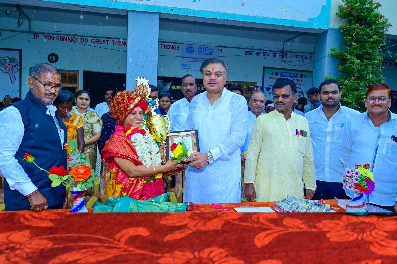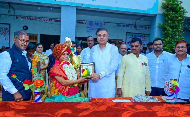 तेर प्रतिनिधी / विजय कानडे : लातूर येथील सुनंदा जगताप यांचे सामाजिक कार्य कौतुकास्पद आहे असे प्रतिपादन आ.राणाजगजितसिंह पाटील यांनी केले.धाराशिव तालुक्यातील तेर येथे कै.डाॅ.चंद्रकलादेवी पाटील स्मृती पुरस्कार वितरण प्रसंगी आयोजित कार्यक्रमात आ.पाटील यांनी प्रतिपादन केले.या कार्यक्रमाच्या अध्यक्षस्थानी महाराष्ट्र संत विद्यालयाचे मुख्याध्यापक जे.के.बेदरे होते तर धाराशिव पंचायत समितीचे माजी सभापती बाळासाहेब वाघ, श्री संत गोरोबा काका शिक्षण प्रसारक मंडळाचे अध्यक्ष पद्माकर फंड,तेर सोसायटीचे माजी चेअरमन व्यंकटराव माळी, विजयकुमार लाड,तेरचे सरपंच दिदी काळे,उपसरपंच श्रीमंत फंड,तेर सोसायटीचे चेअरमन सतिष कदम, तेरणा विद्यालयाचे मुख्याध्यापक संतोष गायकवाड, महाराष्ट्र संत विद्यालयाचे पर्यवेक्षक एस.एस.पाटील,स्वामी विवेकानंद बहुउद्देशीय संस्थेचे सचिव प्रवीण साळुंके, माजी सरपंच नवनाथ नाईकवाडी, माजी उपसरपंच मज्जित मनियार,स्वयंम शिक्षण प्रयोग च्या संवाद सहाय्यक जयश्री माळी, उमेद च्या प्रेरीका पूजा चव्हाण, भाग्यश्री भक्ते, वैशाली देवकते,जोती नाईकवाडी यांची प्रमुख उपस्थिती होती.