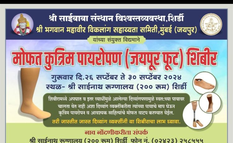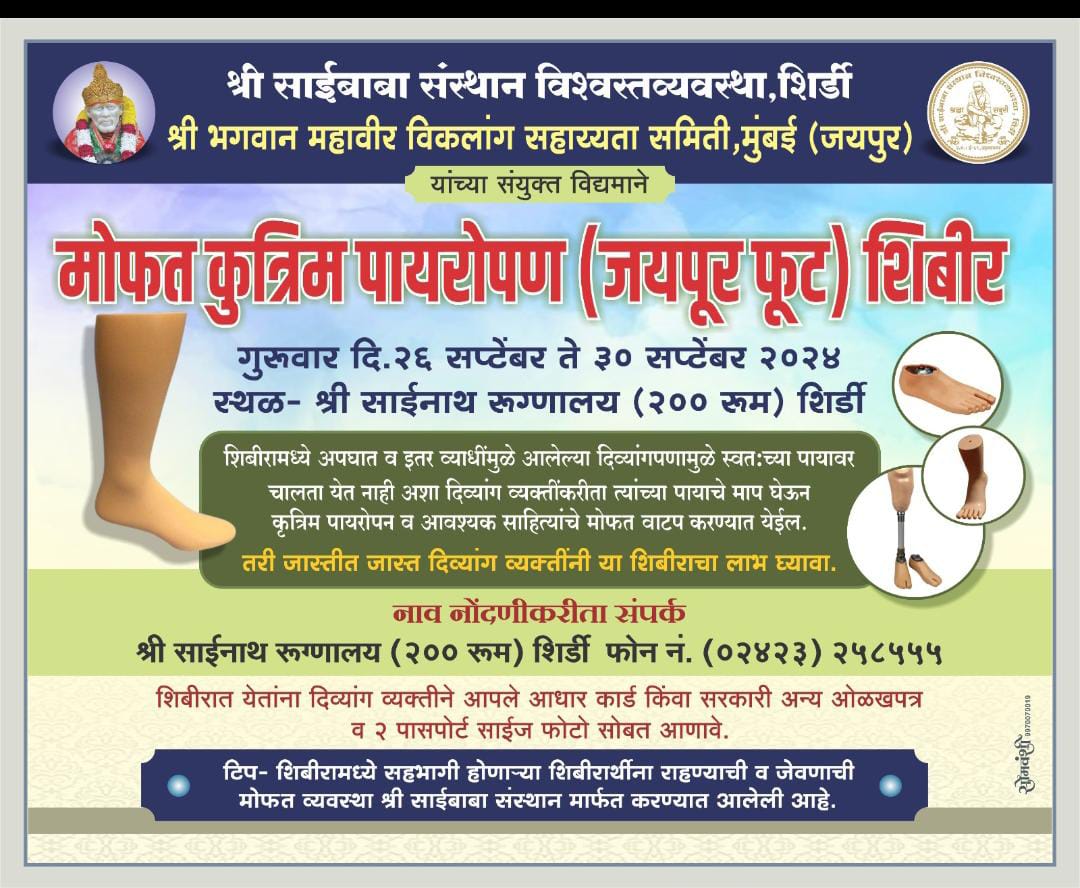 शिर्डी प्रतिनिधी / विट्ठल ठोंबरे : श्री साईबाबा संस्थान विश्वस्तव्यवस्था, शिर्डी व श्री भगवान महावीर विकलांग सहाय्यता समिती (मुंबई) जयपूर यांचे संयुक्त विद्यमाने ०५ वर्षानंतर पुन्हा एकदा मोफत कृत्रीम पायरोपण (जयपूर फुट) शिबीर व गरजु दिव्यांगासाठी साहित्य वाटप दिनांक दि.२६/०९/२०२४ ते दि.३०/०९/२०२४ या दरम्यान करणेत येणार आहे. सदर शिबीरामध्ये गरजु व लाभार्थी दिव्यांग व्यक्तींची तपासणी करणेत येऊन आवश्यकतेनुसार दिव्यांग व्यक्तीच्या पायाचे माप घेऊन त्या मापाचे कृत्रीम पाय रोपण करण्यात येणार आहे. नवीन पाय बसविणे बरोबर जुन्या कृत्रीम पायाची दुरुस्ती देखील सदर शिबीरामध्ये मोफत करण्यात येईल.