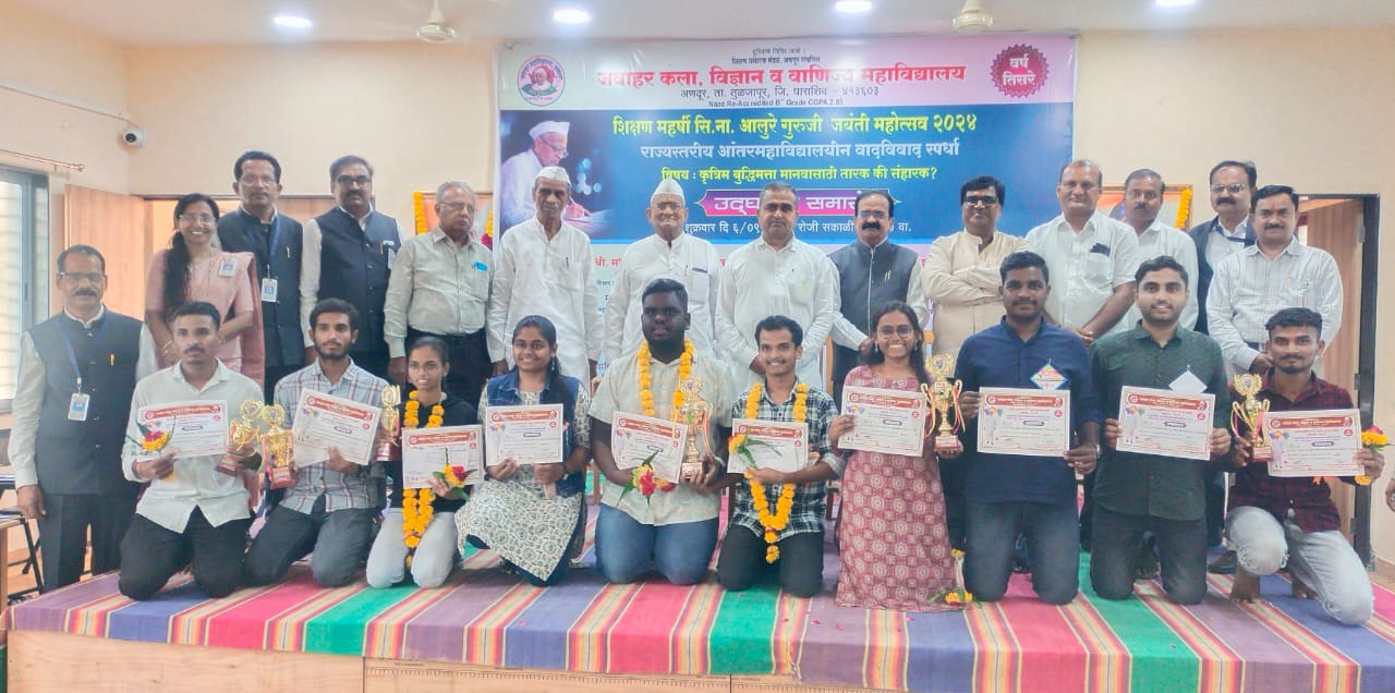 या कार्यक्रमाला महाविद्यालय विकास समितीचे सदस्य मारुती खोबरे, ज्येष्ठ गुरुवर्य व ग सूर्यवंशी, ग्रामपंचायत सदस्य बालाजी घुगे, जवाहर महाविद्यालयाचे प्राचार्य डॉ. उमाकांत चनशेट्टी,उपप्राचार्य डॉ.मल्लिनाथ लंगडे यांची व्यासपीठावर प्रमुख उपस्थिती होती. कार्यक्रमाला व्यासपीठावरील सर्व मान्यवरांच्या हस्ते शिक्षण महर्षी सि ना आलुरे गुरुजी यांच्या प्रतिमेचे पूजन व दीप प्रज्वलन करून सुरुवात करण्यात आली.कार्यक्रमाच्या प्रास्ताविकेमध्ये महाविद्यालयाचे प्राचार्य डॉ उमाकांत चनशेट्टी यांनी महाविद्यालयाच्या वतीने आयोजित विविध उपक्रमाबद्दल माहिती देताना राज्यस्तरीय अंतर महाविद्यालयीन वादविवाद स्पर्धेचे महत्त्व स्पष्ट केले. त्याचबरोबर स्पर्धेसाठी हा विषय निवडताना आलेले अनुभवही त्यांनी व्यक्त केले आणि अहवाल वाचन केले.