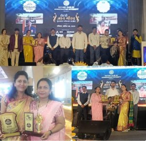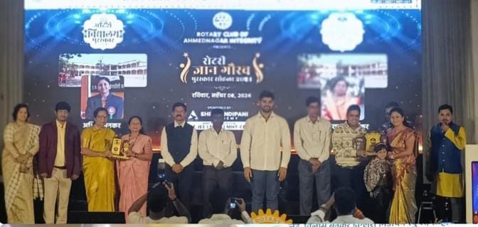 राहुरी तालुका प्रतिनिधी / ज्ञानेश्वर सुरशे : आहिल्यानगर येथे Rotary club of Ahmednagar Integrity च्या वतीने रोटरी ज्ञान गौरव पुरस्कार सोहळा २०२४ आयोजित करण्यात आला होता. कार्यक्रमाच्या अध्यक्ष व रयत शिक्षण संस्था सातारा च्या सदस्या श्रीमती मीनाताई माणिकराव जगधने या होत्या, तसेच शिक्षण आयुक्त महाराष्ट्र शासन दिनकर टेमकर, शिक्षणाधिकारी (माध्य.) अशोक कडूस, शिक्षणाधिकारी (प्राथ.)भास्कर पाटील, शिक्षणाधिकारी (योजना) बाळासाहेब बुगे आदी मान्यवर उपस्थित होते.उपस्थित मान्यवरांच्या हस्ते संपूर्ण जिल्ह्यातील विद्यालय व त्यांचे प्रतिनिधी यांच्या मधून आदर्श विद्यालय व विद्या विभुषण पुरस्कार २०२४ पुरस्कार प्रदान करण्यात आले.