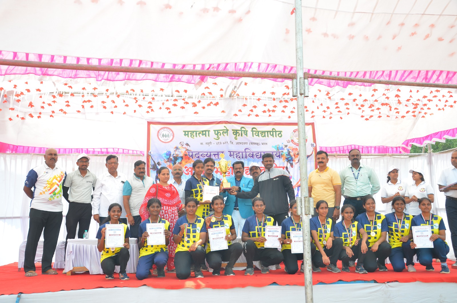 महात्मा फुले कृषि विद्यापीठ, राहुरी येथील क्रीडा भवनात दोन दिवसीय आंतरमहाविद्यालयीन व्हॉलीबॉल स्पर्धेचे आयोजन करण्यात आले होते. या स्पर्धेच्या बक्षीस वितरण कार्यक्रमाच्या अध्यक्षस्थानावरुन डॉ. साताप्पा खरबडे बोलत होते. यावेळी विद्यार्थी परिषदेचे उपाध्यक्ष डॉ. विजू अमोलिक, विद्यार्थी कल्याण अधिकारी तथा राष्ट्रीय सेवा योजनेचे संचालक डॉ. महाविरसिंग चौहान, पदव्युत्तर महाविद्यालयाचे विद्यार्थी कल्याण अधिकारी डॉ. विजय पाटील, माजी क्रीडा अधिकारी प्रा. दिलीप गायकवाड, विद्यापीठाचे क्रीडा अधिकारी डॉ. विलास आवारी, पदव्युत्तर महाविद्यालयाचे क्रीडा अधिकारी डॉ. बाबासाहेब भिंगारदे, स्पर्धेचे पंच प्रा. आदिनाथ कोल्हे उपस्थित होते.
