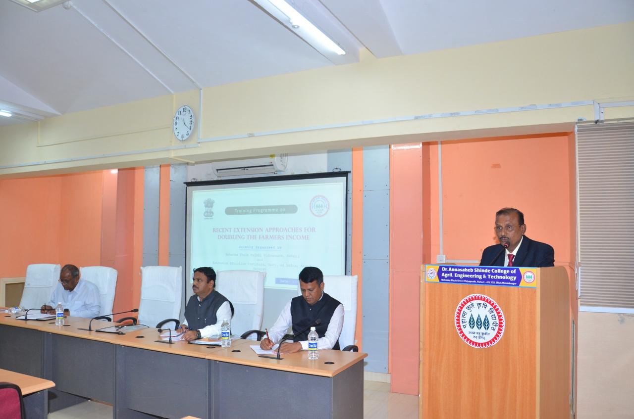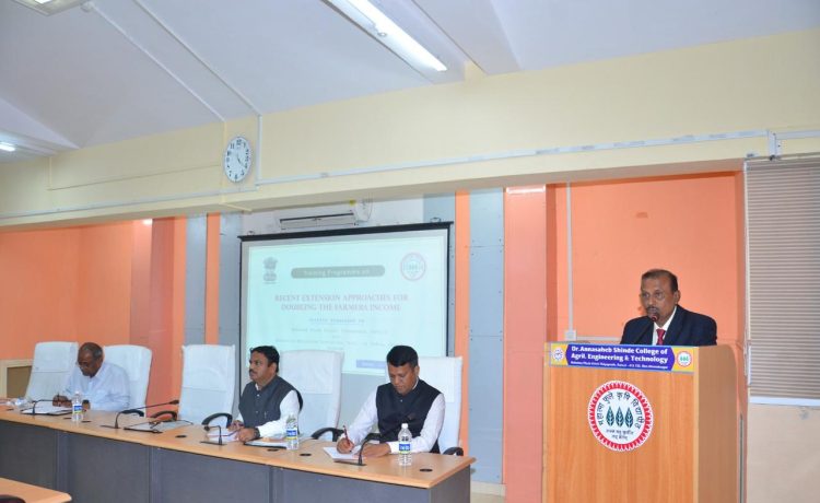 महात्मा फुले कृषि विद्यापीठ, राहुरी व गुजरात राज्यातील आनंद येथील विस्तार शिक्षण संस्था यांच्या संयुक्त विद्यमाने शेतकर्यांचे उत्पन्न दुप्पट करण्यासाठी विस्तार शिक्षणाच्या नाविन्यपूर्ण पध्दती या विषयावरील तीन दिवसीय प्रशिक्षणाचे आयोजन करण्यात आले आहे. या प्रशिक्षण कार्यक्रमाच्या उद्घाटनप्रसंगी अध्यक्षस्थानावरुन कुलगुरु डॉ. पी.जी. पाटील बोलत होते. याप्रसंगी संशोधन संचालक डॉ. विठ्ठल शिर्के, विस्तार शिक्षण संचालक डॉ. गोरक्ष ससाणे, आनंद येथील विस्तार शिक्षण संस्थेचे शास्त्रज्ञ डॉ. ए.पी. निनाम्मा उपस्थित होते.