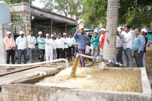 यावेळी शेतकर्यांनी देशी गायींच्या गोठ्याला भेट देवून शेणापासून स्लरी तयार करण्याच्या युनिटची पाहणी केली. या स्लरीचा वापर ते त्यांच्या डाळिंब, पेरु, द्राक्ष, पपई या फळबागांसाठी करतात. यावेळी श्री. राहुल रसाळ यांनी शेतकर्यांच्या शंकाचे निरसन केले. प्रकल्पाचे प्रमुख समन्वयक डॉ. पंडित खर्डे यांचे हस्ते शेतकरी अभ्यास दौर्याला प्रारंभ झाला. या दौर्यात प्रकल्पाचे सहसमन्वयक डॉ. सचिन सदाफळ, डॉ. भगवान देशमुख, प्रक्षेत्र सहाय्यक श्री. किरण मगर, श्री. राहुल कोर्हाळे आदींनी सहभाग घेतला. शेतकरी प्रथम प्रकल्पांतर्गत असलेल्या तांभेरे, कानडगांव, कणगर, चिंचविहिरे या गावातील 44 डाळिंब उत्पादक शेतकरी या अभ्यास दौर्यात सहभागी झाले होते.