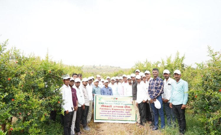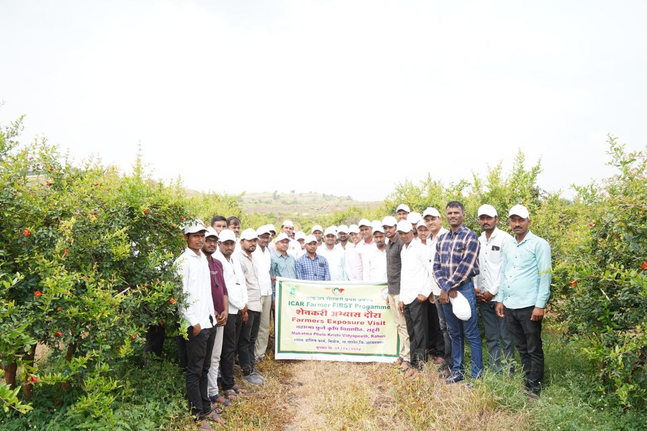 राहुरी विद्यापीठ / आर.आर.जाधव : महात्मा फुले कृषि विद्यापीठाचे कुलगुरु डॉ. पी.जी. पाटील व विस्तार शिक्षण संचालक डॉ. जी.के. ससाणे यांच्या मार्गदर्शनाखाली नवी दिल्ली येथील भारतीय कृषि अनुसंधान परिषदेच्या शेतकरी प्रथम प्रकल्पांतर्गत निघोज, ता. पारनेर येथे रसाळ डाळिंब फार्म येथे एक दिवसीय शेतकरी अभ्यास दौर्याचे आयोजन करण्यात आले होते. यावेळी युवा प्रगतशील शेतकरी श्री. राहुल रसाळ यांनी शेतकर्यांना त्यांच्या प्रत्यक्ष शेतावर मार्गदर्शन केले. ते म्हणाले की डाळिंब लागवड, तण नियंत्रण, एकात्मिक अन्नदव्य व्यवस्थापन, पाणी व्यवस्थापन या विषयी सखोल मार्गदर्शन केले.