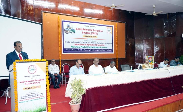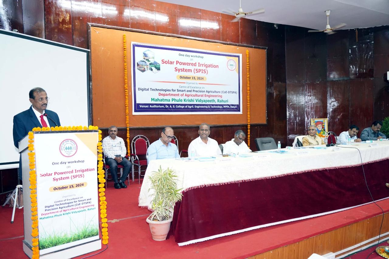 महात्मा फुले कृषि विद्यापीठ, राहुरी येथील कृषि अभियांत्रिकी विभागातील सेंटर ऑफ एक्सलन्स- स्मार्ट व काटेकोर शेतीसाठी डिजिटल तंत्रज्ञान प्रकल्पाने या एक दिवसीय कार्यशाळेचे आयोजन केले आहे. या एक दिवसीय कार्यशाळेचा विषय सौरऊर्जेवरील सिंचन प्रणाली हा आहे. या कार्यशाळेच्या उद्घाटन प्रसंगी झालेल्या कार्यक्रमावेळी अध्यक्षस्थानावरून महात्मा फुले कृषि विद्यापीठाचे कुलगुरू डॉ. पी.जी. पाटील बोलत होते. यावेळी या कार्यक्रमासाठी प्रमुख पाहुणे म्हणून नवी दिल्ली येथील बीसा या संस्थेचे व्यवस्थापकीय संचालक प्रा. अरुण जोशी उपस्थित होते. याप्रसंगी विशेष अतिथी म्हणून महात्मा फुले कृषि विद्यापीठाचे माजी संशोधन संचालक डॉ. सुनील गोरंटीवार उपस्थित होते. यावेळी संशोधन संचालक डॉ. विठ्ठल शिर्के, विस्तार शिक्षण संचालक डॉ. गोरक्ष ससाणे, कृषि अभियांत्रिकी विभाग प्रमुख तथा सेंटर ऑफ एक्सलन्सचे प्रमुख संशोधक डॉ. मुकुंद शिंदे व पदव्युत्तर महाविद्यालयाचे सहयोगी अधिष्ठाता डॉ. साताप्पा खरबडे उपस्थित होते.