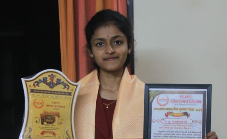 पुणे प्रतिनिधी / प्रवीण वाघमोडे : विद्यानिकेतन सोशल फाउंडेशन यांच्या वतीने राज्यस्तरीय महाराष्ट्र स्टार गौरव पुरस्कार २०२४ या मा. कु. सायली ढेबे यांना प्रदान करण्यात आला. विद्यानिकेतन संस्थेचे वरिष्ठ मंडळी तसेच डॉ. अशोक नगरकर सर ( ज्येष्ठ शास्त्रज्ञ, पुणे ), मा. भिडेवाडाकार विजय अभिमान वडवेराव (आयोजक: भिडेवाडा देशातील मुलींची पहिली शाळा आंतरराष्ट्रीय काव्यजागर अभियान ), मा.सौ.प्रियांका शिंदे (सिने अभिनेत्री), मा. श्री. संतोष नलावडे ( सिने अभिनेते ) व इतर मान्यवरांच्या हस्ते हा पुरस्कार प्रदान करण्यात आला.