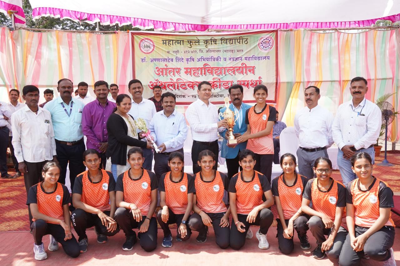 राहुरी विद्यापीठ / आर.आर.जाधव : महात्मा फुले कृषि विद्यापीठाचे कुलगुरू डॉ. पी. जी. पाटील यांच्या मार्गदर्शनाखाली डॉ. अण्णासाहेब शिंदे कृषी अभियांत्रिकी व तंत्रज्ञान महाविद्यालयाच्या वतीने विद्यापीठातील क्रीडा भवनात या आंतर महाविद्यालयीन मैदानी स्पर्धेचे आयोजन करण्यात आले होते. या मैदानी स्पर्धांचा समारोप प्रसंगी झालेल्या कार्यक्रमाचे अध्यक्षस्थानी महात्मा फुले कृषि विद्यापीठाचे अधिष्ठाता डॉ. दिलीप पवार होते.