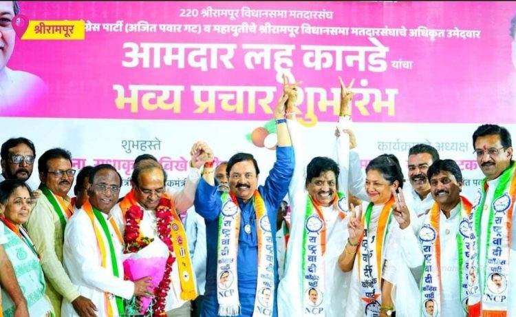 आमदार लहू कानडे यांचा प्रचार नारळ शुभारंभ खासदार तटकरे व पालकमंत्री विखे यांच्या उपस्थितीत संपन्न