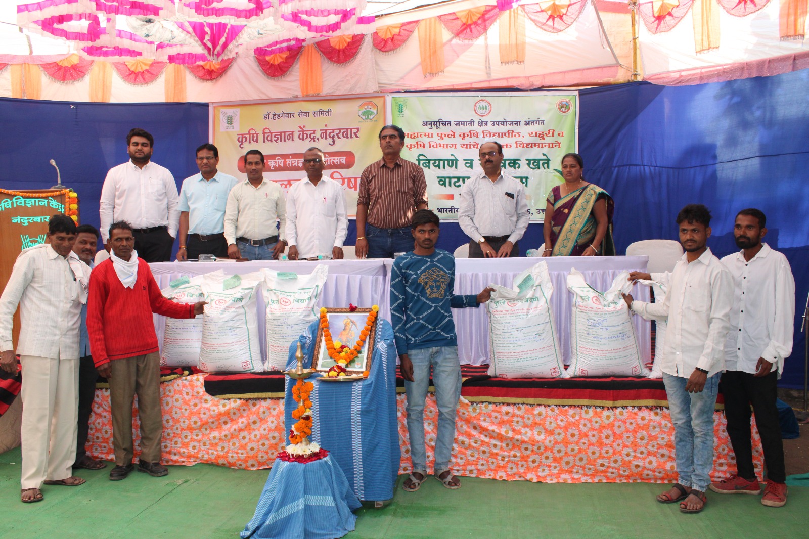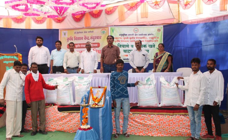 राहुरी विद्यापीठ / आर.आर.जाधव : महात्मा फुले कृषि विद्यापीठ, राहुरी अंतर्गत असलेल्या बियाणे विभागाच्या आदिवासी उपयोजनेअंतर्गत प्राप्त अनुदानातुन डॉ. हेडगेवार समिती, कृषि विज्ञान केंद्र, नंदुरबार आयोजित 18 व्या कृषि तंत्रज्ञान महोत्सवात पशुपालक परिषदेचे औचित्य साधून आदिवासी पशुपालक शेतकर्यांना ओट चारा बियाण्याचे मोफत वाटप करण्यात आले. महात्मा फुले कृषि विद्यापीठाचे कुलगुरु डॉ. पी.जी. पाटील व संशोधन संचालक डॉ. विठ्ठल शिर्के यांच्या मार्गदर्शनाखाली आणि कुलसचिव तथा प्रमुख शास्त्रज्ञ (बियाणे) डॉ. नितीन दानवले यांच्या नेतृत्वाखाली या कार्यक्रमाचे आयोजन करण्यात आले होते.