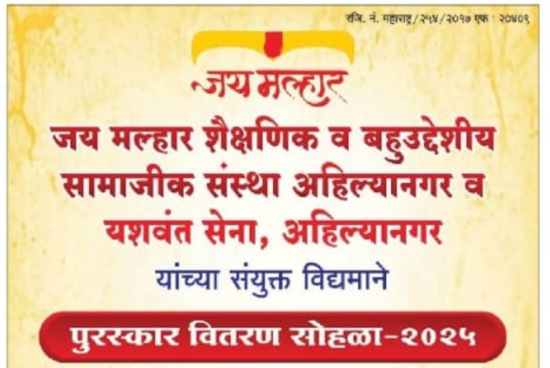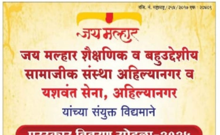 जय मल्हार शैक्षणिक व बहुउद्देशीय सामाजिक संस्था अहिल्यानगर व यशवंत सेना, अहिल्या नगर यांच्या संयुक्त विद्यमाने पुरस्कार वितरण सोहळ्याचे आयोजन..