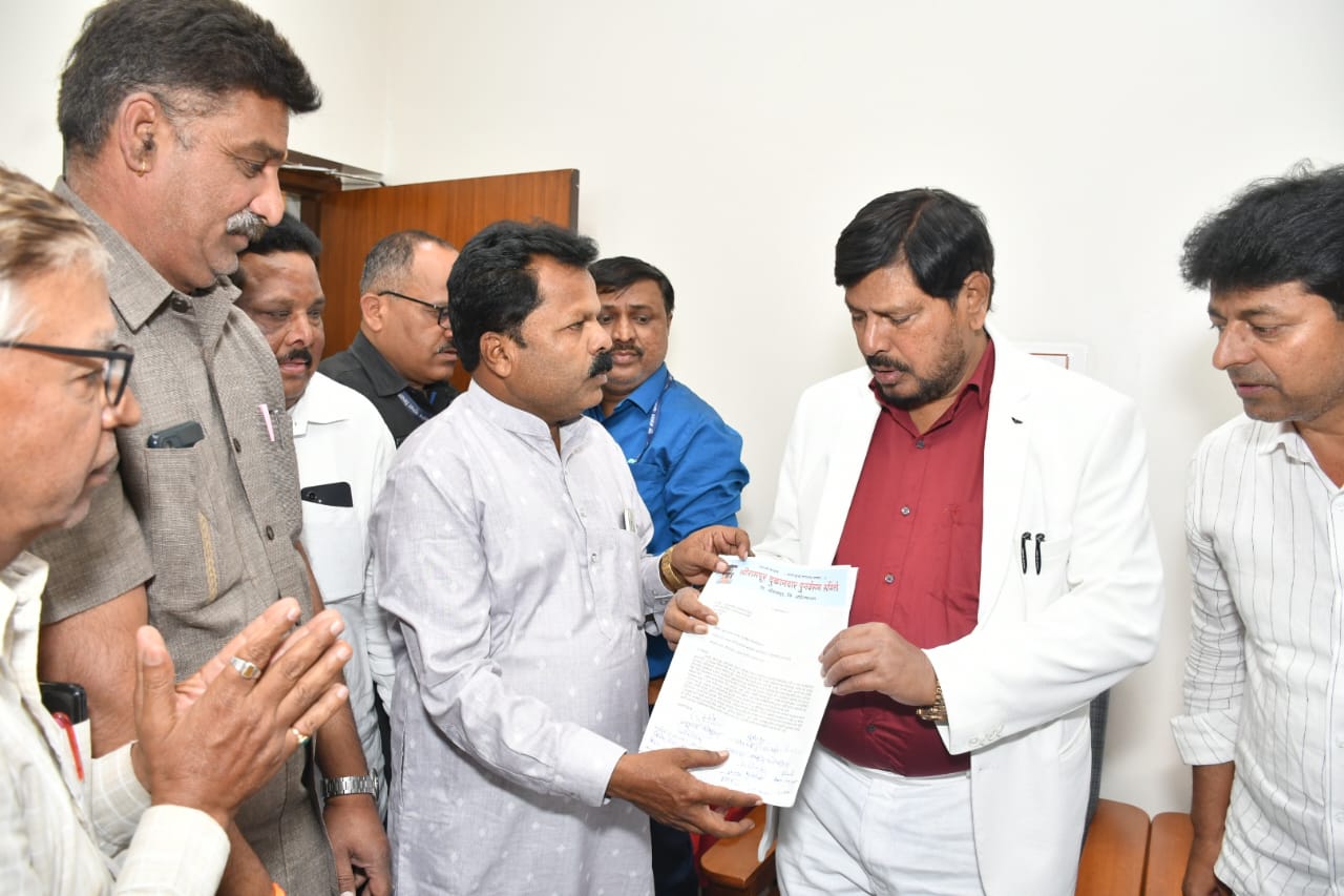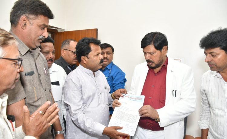 श्रीरामपूर प्रतिनिधी / इनायत अत्तार : श्रीरामपुरातील गेली 40 वर्षापासून नगरपालिकेच्या हद्दीत आपला विविध प्रकारचा व्यवसाय करून आपल्या कुटुंबाचा उदारनिर्वाह करून श्रीरामपूर नगरपालिकेला न चुकता कर भरत असलेले दुकानदार यांची दुकाने नगरपालिकेने 27 फेब्रुवारी पासून जमीन उद्ध्वस्त केले आहे त्या दुकानदाराचे पुनर्वसन करावे तसेच तात्पुरत्या स्वरूपात त्यांना ताबडतोब पाच फुटाची जागा व्यवसाय करण्यासाठी उपलब्ध करून द्यावी या मागणीचे निवेदन केंद्रीय सामाजिक राज्यमंत्री रामदास आठवले यांना श्रीरामपूर दुकानदार पुनर्वसन समितीचे संयोजक सुभाष दादा त्रिभुवन मर्चंट असोसिएशनचे अध्यक्ष गौतम उपाध्ये विस्थापित व्यापाऱ्यांच्या हस्ते निवेदन देण्यात आले.