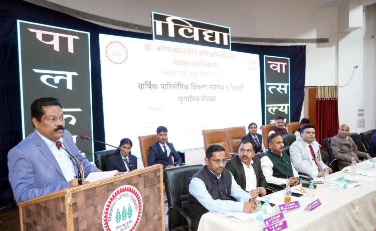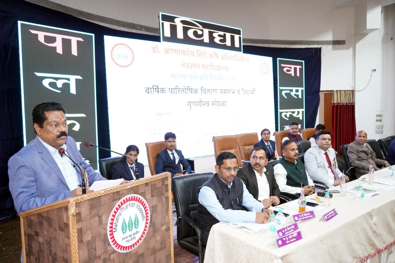 महात्मा फुले कृषि विद्यापीठ, राहुरी येथील डॉ. अण्णासाहेब शिंदे कृषि अभियांत्रिकी व तंत्रज्ञान महाविद्यालयामध्ये पालक दिन-2025 उत्साहात साजरा करण्यात आला. या कार्यक्रमांतर्गत डॉ. नानासाहेब पवार सभागृहात वार्षिक पारितोषीक वितरण समारंभ व विद्यार्थी गुणगौरव सोहळा आयोजीत करण्यात आला होता. यावेळी या कार्यक्रमाच्या अध्यक्षस्थानावरुन प्रभारी कुलगुरु डॉ. साताप्पा खरबडे बोलत होते. याप्रसंगी प्रमुख पाहुणे म्हणुन झारखंड राज्यातील पोलिस उपमहानिरीक्षक श्री. मनोज चोथे उपस्थित होते.