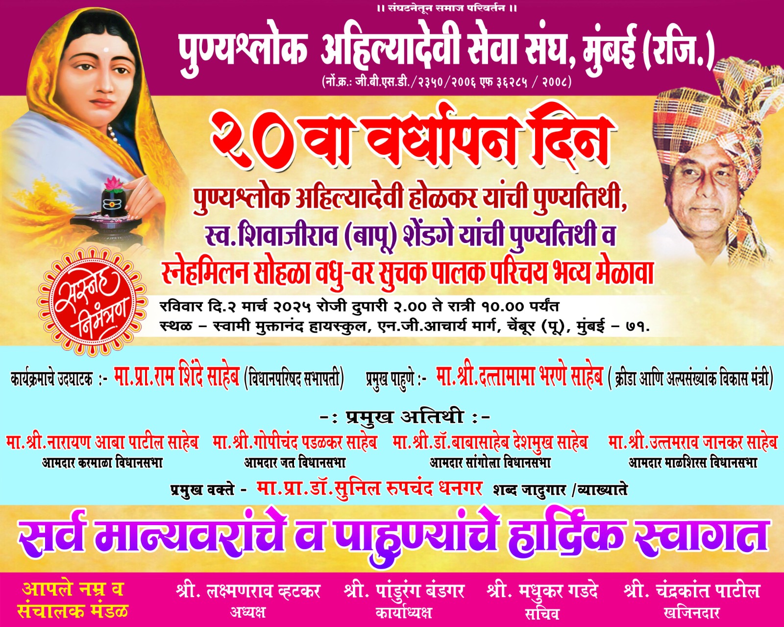 या कार्यक्रमाला कार्यक्रमाचे उद्घाटक विधानपरिषदेचे सभापती प्रा.राम शिंदे, प्रमुख पाहुणे क्रीडा आणि अल्प संख्याक विकास मंत्री आणि प्रमुख अतिथी आमदार नारायण आबा पाटील, आमदार गोपीचंद पडळकर, आमदार डॉ बाबासाहेब देशमुख, आमदार उत्तमराव जानकर आदी मान्यवर उपस्थित राहणार आहेत, पुण्यश्लोक अहिल्यादेवी सेवा संघाचे संचालक मंडळ अध्यक्ष लक्ष्मण व्हटकर, कार्याध्यक्ष पांडुरंग बंडगर, सचिव मधुकर गडदे, खजिनदार चंद्रकांत पाटील यांनी या २० वर्धापनदिना निमित्त होणाऱ्या विविध कार्यक्रमांला समाजातील जास्तीत जास्त महिलांनी व पुरुषांनी उपस्थित राहून कार्यक्रमाची शोभा वाढवावी असे आवाहन केले आहे.