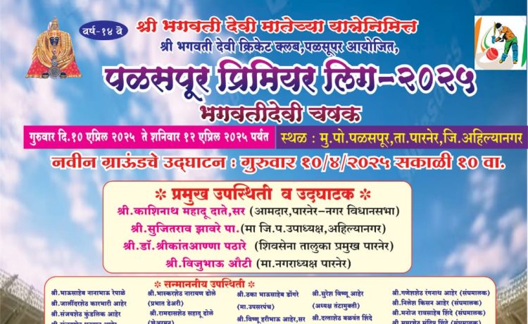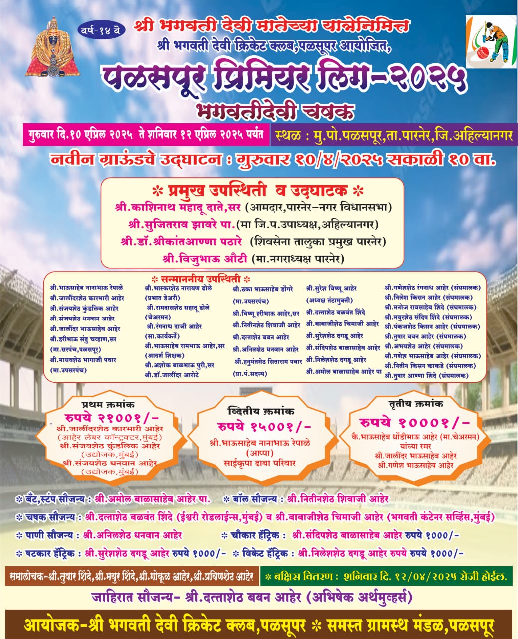 विशेष प्रतिनिधी पारनेर / वसंत रांधवण : तालुक्यातील पळसपूर परिसरातील प्रसिद्ध असलेल्या श्री भगवती देवी मातेच्या यात्रेनिमित्त ग्रामस्थांच्या व श्री भगवती देवी क्रिकेट क्लब यांच्यावतीने भव्य टेनिस बॉल क्रिकेट स्पर्धेचे आयोजन करण्यात आले आहे.पळसपूर प्रिमियर लिग २०२५ , भगवतीदेवी चषक क्रिकेट स्पर्धेचे आयोजन आज गुरुवार दि.१० एप्रिल ते १२ एप्रिल सकाळी १० वाजता नविन ग्राउंड येथे केले आहे, अशी माहिती श्री भगवती देवी क्रिकेट क्लब व पळसपूर ग्रामस्थांनी दिली. या कार्यक्रमास आमदार काशिनाथ दाते,जिल्हा परिषदेचे माजी उपाध्यक्ष सुजित झावरे पाटील, शिवसेना पारनेर तालुकाप्रमुख डॉ. श्रीकांत पठारे,व माजी नगराध्यक्ष विजुभाऊ औटी प्रमुख पाहुणे म्हणून उपस्थित राहणार आहेत.या स्पर्धेचे हे १४ वे वर्ष आहे,तसे पाहिले तर पळसपूर हे गाव पहिल्यापासूनच क्रिकेटप्रेमी म्हणून ओळखले जाते. पळसपूर या ग्रामीण भागातील गावामध्ये पूर्वीपासूनच क्रिकेट स्पर्धेचे आयोजन करण्यात येत आहे.