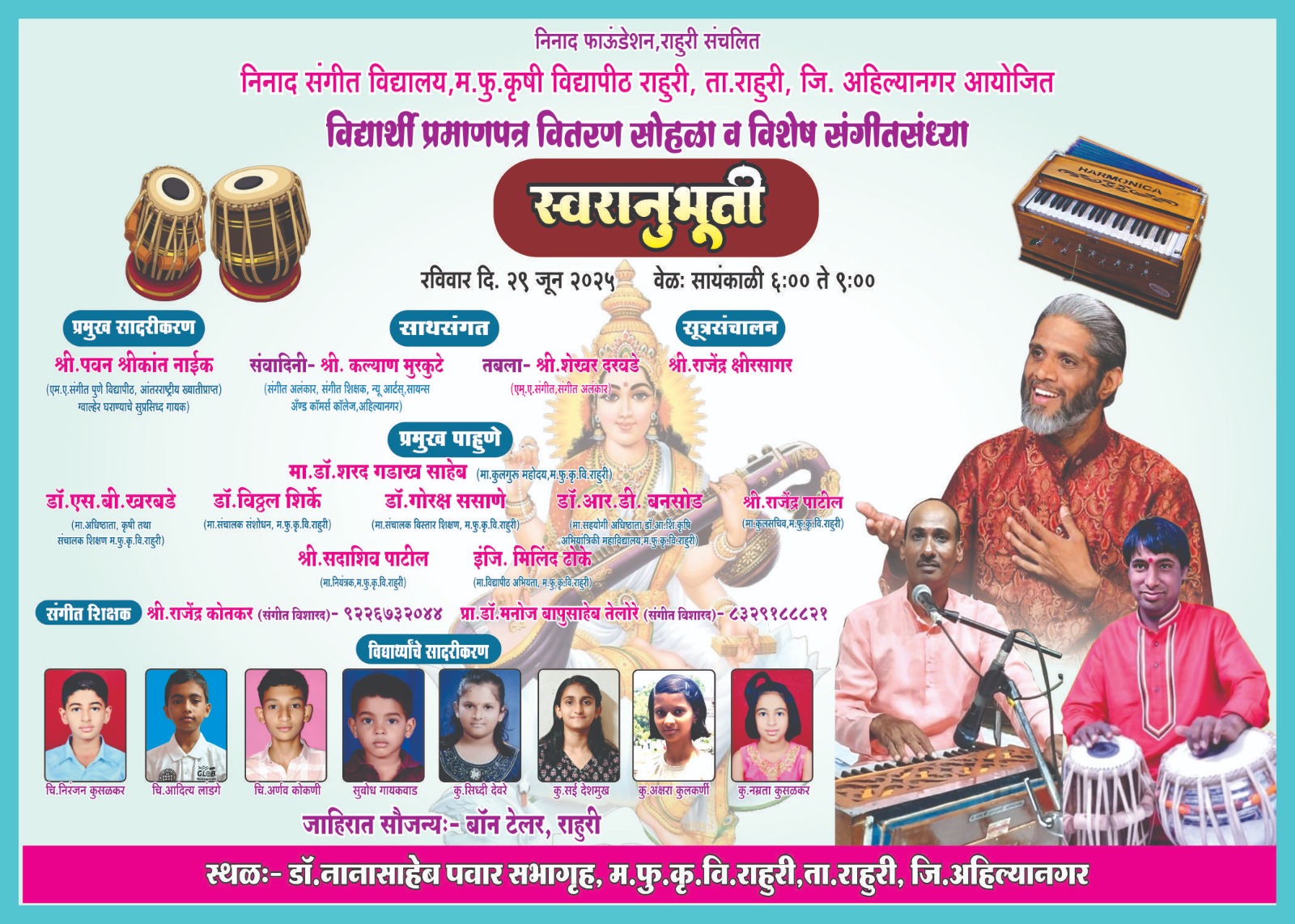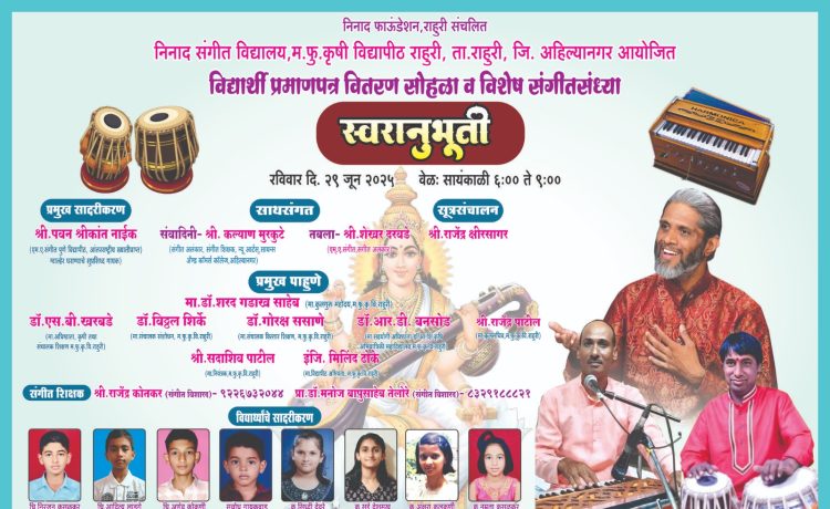 राहुरी विद्यापीठ : निनाद फाउंडेशन, राहुरी संचालित निनाद संगीत विद्यालय आणि महात्मा फुले कृषी विद्यापीठ, राहुरी यांच्या संयुक्त विद्यमाने “स्वरानुभूती” हा विशेष संगीतसंध्या कार्यक्रम आणि विद्यार्थी प्रमाणपत्र वितरण सोहळा रविवार, २९ जून २०२५ रोजी सायंकाळी ६:०० ते ९:०० या वेळेत डॉ. नानासाहेब पवार सभागृह, म.फु.कृ.वि. राहुरी येथे मोठ्या उत्साहात संपन्न होणार आहे.