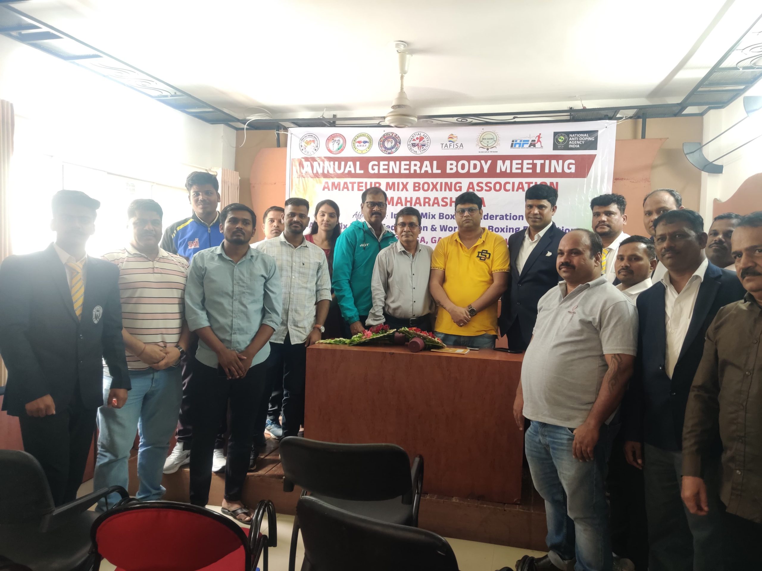 वार्षिक सर्वसाधारण सभा ॲॅमॅच्युअर मिक्स बाॅक्सिंग असोसिएशन चे कार्याध्यक्ष प्रशांत मोहिते सर यांच्या अध्यक्षतेखाली पार पडली.ही सर्व साधारण सभा अतिशय खेळी-मेळीच्या वातावरणात पार पडली.मिक्स बॉक्सिंग खेळाचा प्रत्येक जिल्ह्यात जास्तीत जास्त कसा प्रचार ,प्रसार व विकास कसा होईल यावर चर्चा झाली.या सभे मध्ये बिनविरोध महाराष्ट्र राज्य ची कार्यकारिणी जाहीर करण्यात आली .ती पुढीलप्रमाणे