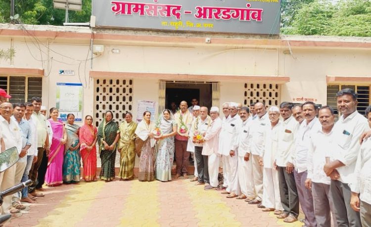आरडगाव ( राहुरी) / सोमनाथ वाघ : राहुरी तालुक्यातील आरडगावच्या उपसरपंचपदी संगीता नंदकुमार तांबे यांची नुकतीच बिनविरोध निवड करण्यात आली. मावळते उपसरपंच नीलेश जगधने यांनी राजीनामा दिल्याने रिक्त असलेल्या उपसरपंचपदासाठी सरपंच सुरेखा रवींद्र म्हसे यांच्या अध्यक्षतेखाली ग्रामपंचायत कार्यालयात सदस्यांच्या बैठकीत ही निवडप्रक्रिया ग्रामपंचायत अधिकारी घाडगे यांनी पार पाडली. संगीता तांबे यांच्या नावाची सूचना सचिन खुरुद यांनी मांडली. यावेळी सदस्य उत्तम रावसाहेब वने, निलेश जगधने, सुरेंद्र जाधव, मंदाबाई दिलीप म्हसे, स्वाती किशोर गागरे, मनीषा ज्ञानदेव जाधव, सुमन, राजेंद्र जाधव, लीलाबाई झुगे, पल्लवी काळे उपस्थित होते. निवडीनंतर तांबे यांचा सत्कार करण्यात आला. यावेळी शिवाजी वने, गोविंद म्हसे, केशव म्हसे, रवींद्र म्हसे, दत्तात्रय काळे, अशोक काळे, इंद्रभान झुगे, दिलीप म्हसे, सुरेश झुगे, बापूसाहेब धसाळ, चंद्रकांत म्हसे, नंदकुमार तांबे, मयूर धसाळ, सोपान झुगे, पाटील साहेब काळे, नितीन काळे, ज्ञानेश्वर काळे, प्रमोद झुगे, भाऊसाहेब जाधव, सागर देशमुख, सुदर्शन म्हसे, राजेंद्र जाधव, अमोल म्हसे, सतीश धसाळ, मारुती झुगे, ग्रामपंचायत अधिकारी घाडगे भाऊसाहेब, दत्तात्रय म्हसे, प्रकाश भांड, सचिन झुगे, संदीप जेऊघाले आदी उपस्थित होते.