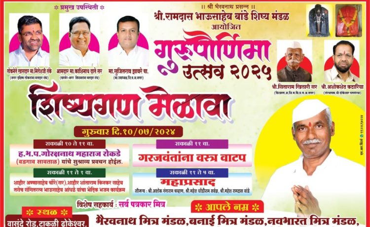 या शिष्यगण मेळाव्यासाठी गुरुवार दि.१० जुलै रोजी सकाळी १० ते ११ वाजेपर्यंत ह.भ.प. गोरक्षनाथ महाराज रोकडे (वडगाव सावताळ) यांचे सुश्राव्य प्रवचन होईल सकाळी ११ वाजता सर्व गरजवंतांना वस्त्र वाटप होणार असून सकाळी ११ ते ५ वा. या वेळेमध्ये अशोक गंगाराम चव्हाण,महेश धोडीराम सर्वश, महेश रामदास बांडे यांच्यातर्फे महाप्रसादाचे आयोजनही या ठिकाणी करण्यात आले आहे.