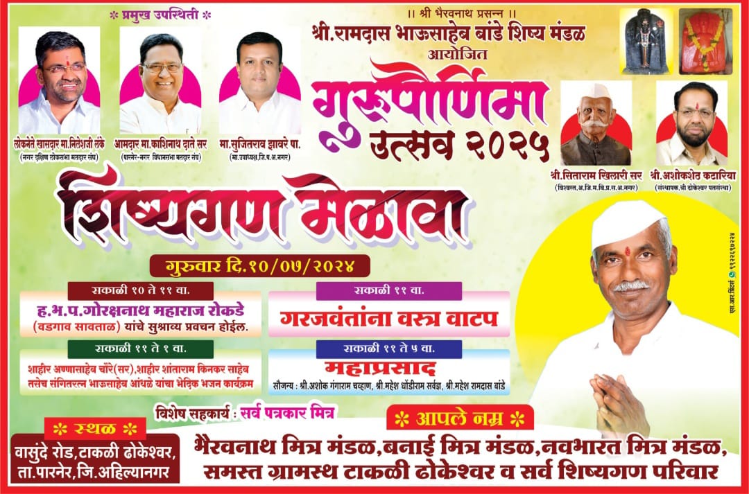 आज टाकळीढोकेश्वर येथे गुरुपौर्णिमेनिमित्त शिष्यगण मेळाव्याचे आयोजन, खासदार निलेश लंके, आमदार काशिनाथ दाते, सुजित झावरे यांची प्रमुख उपस्थिती