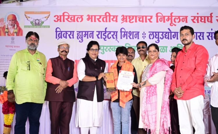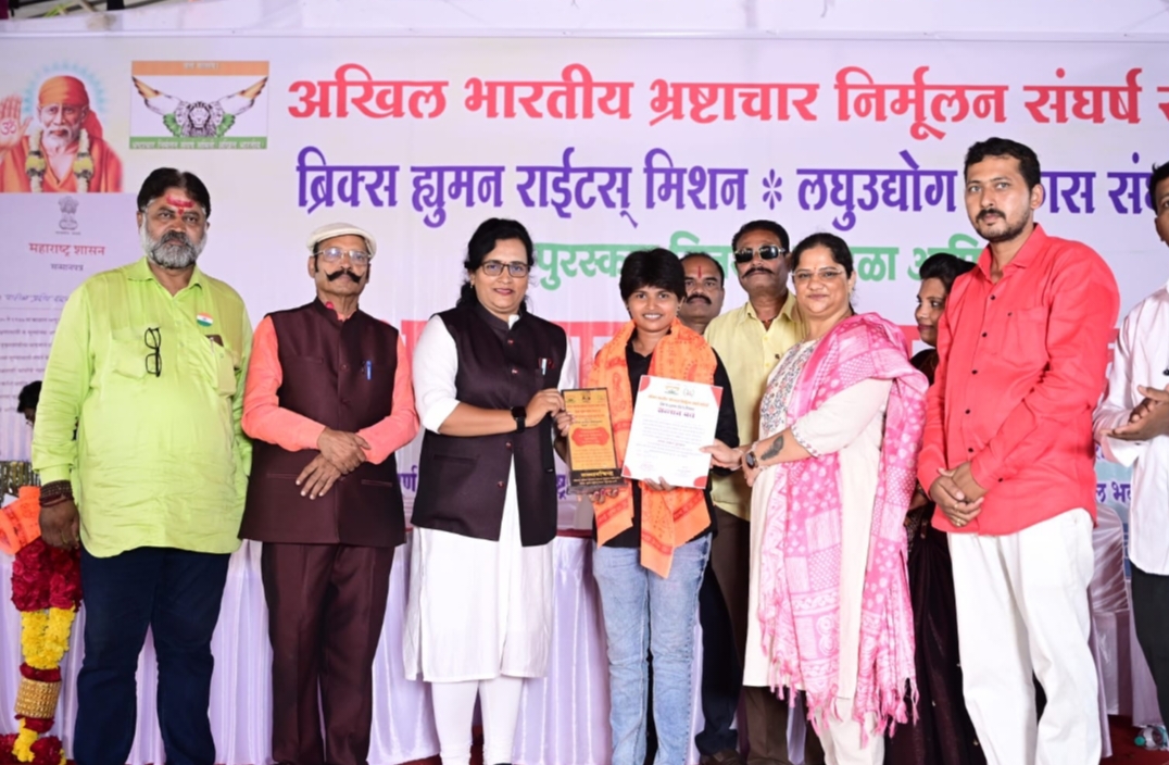 शिर्डी (प्रतिनिधी) : अखिल भारतीय भ्रष्टाचार संघर्ष समिती, ब्रिक्स ह्यूमन राइट्स मिशन, आणि लघुउद्योग विकास संघटना यांच्या संयुक्त विद्यमाने आयोजित पुरस्कार वितरण सोहळा दि. २० जून रोजी शिर्डी येथील साई पालखी निवारा सभागृहात उत्साहात पार पडला. या कार्यक्रमाला राष्ट्रीय अध्यक्ष मा. श्री. प्रदीप पा. खंडापूरकर (बाबा) प्रमुख उपस्थित होते .या गौरव सोहळ्यात विविध क्षेत्रातील उल्लेखनीय कार्य करणाऱ्या व्यक्तींना सन्मानित करण्यात आले. यामध्ये शिर्डी येथील प्रसिद्ध JD महाराष्ट्र न्यूज या यूट्यूब चॅनलच्या संपादिका आणि संचालिका किरणताई जाधव यांना ‘उत्कृष्ट पत्रकार पुरस्कार २०२५-२६’ ने सन्मानित करण्यात आले.