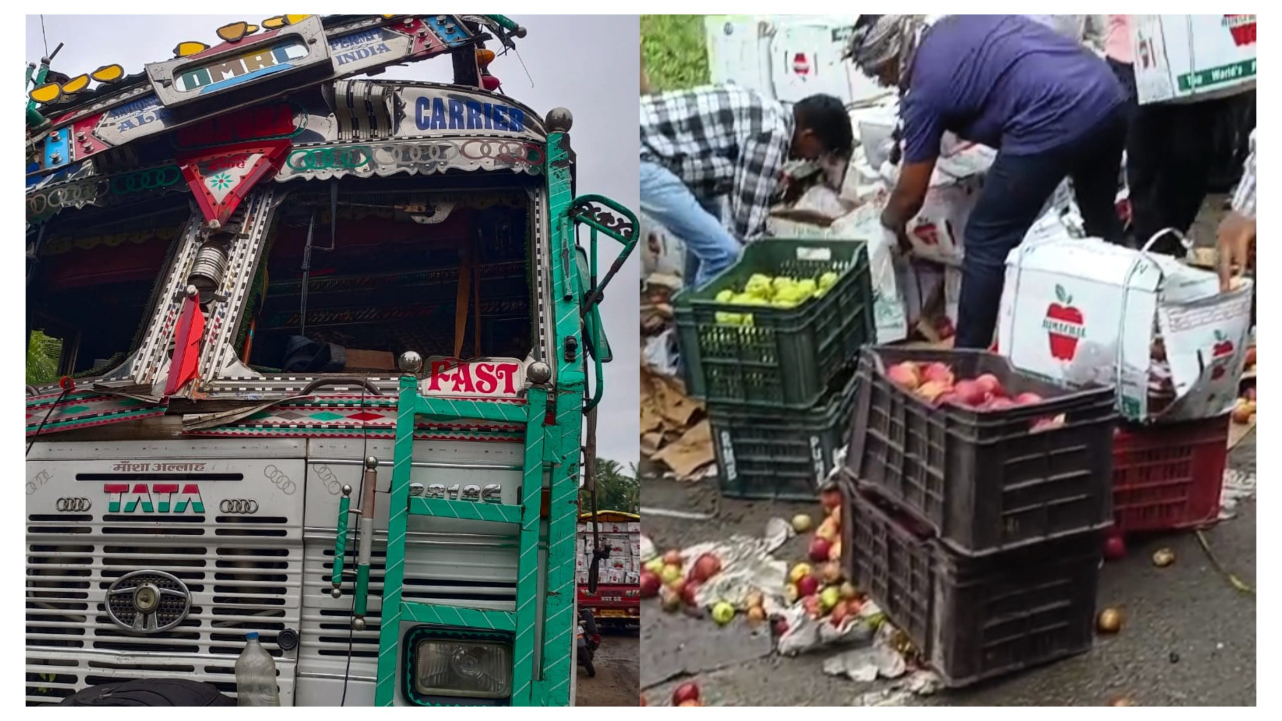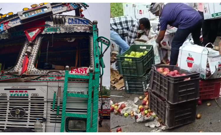 राहुरी शहरातील नगर-मनमाड महामार्गावर सफरचंद भरलेला ट्रक पलटी; वाहनचालक जखमी, सफरचंद घेण्यासाठी नागरिकांची झुंबड