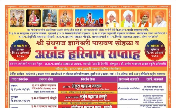 मानोरी येथे १३ ऑगस्टपासून श्री ग्रंथराज ज्ञानेश्वरी पारायण व अखंड हरिनाम सप्ताह भाविकांनी सोहळ्याचा लाभ घ्यावा – ग्रामस्थांचे आवाहन