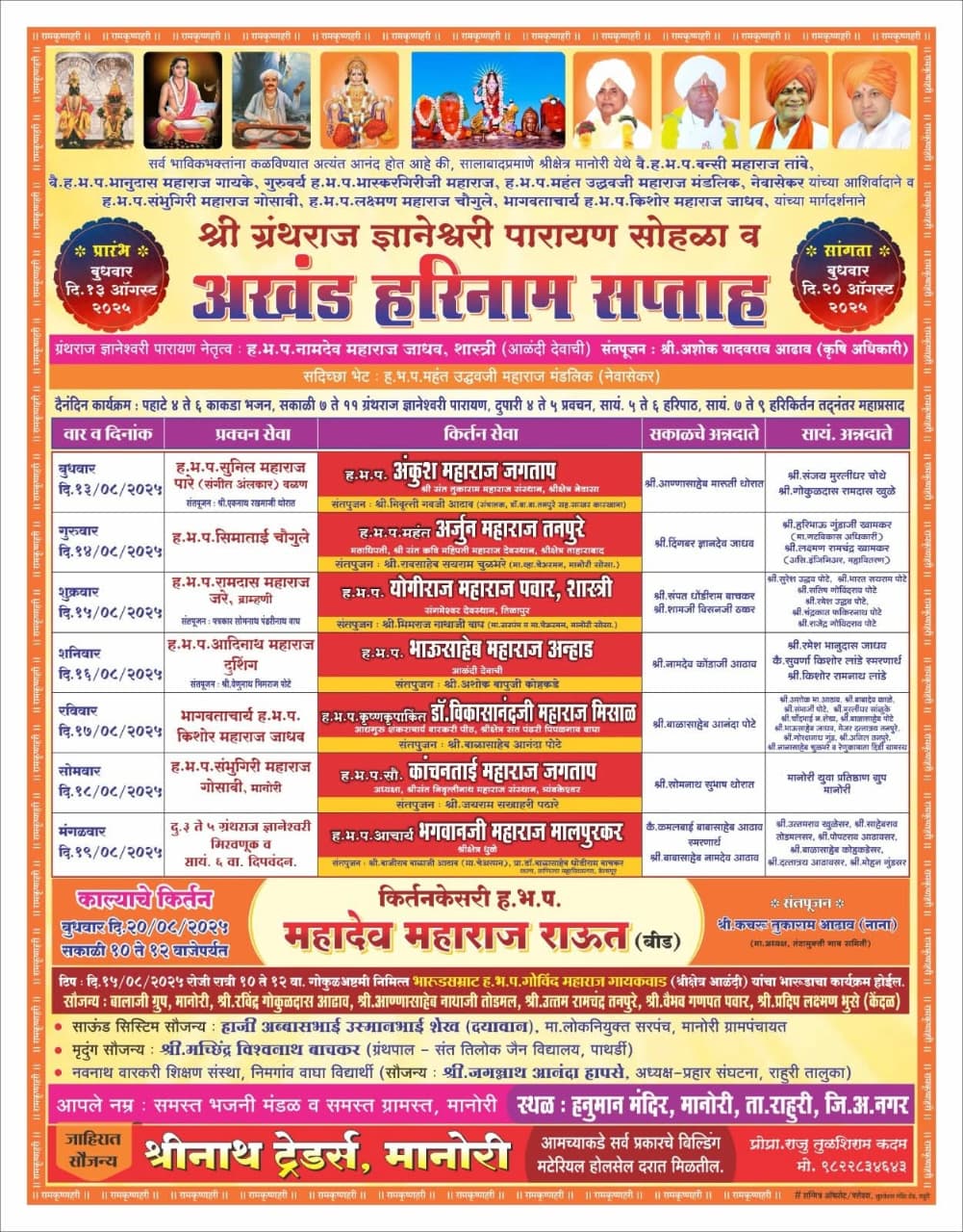 तसेच श्री ग्रंथराज ज्ञानेश्वर पारायण सोहळा व अखंड हरिनाम सप्ताह ग्रंथराज ज्ञानेश्वर पारायण नेतृत्व ह.भ.प नामदेव महाराज जाधव शास्त्री (आळंदी देवीची) हे करणार आहे. या सप्ताहामध्ये नित्याप्रमाणे पहाटे चार ते सहा काकडा भजन, सकाळी सात ते अकरा ज्ञानेश्वरी पारायण, दुपारी चार ते पाच प्रवचन, सायंकाळी पाच ते सहा हरिपाठ, रात्री सात ते नऊ हरिकीर्तन, त्यानंतर महाप्रसाद असा हा नित्याचा कार्यक्रम असणार आहे.