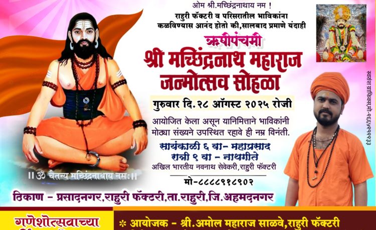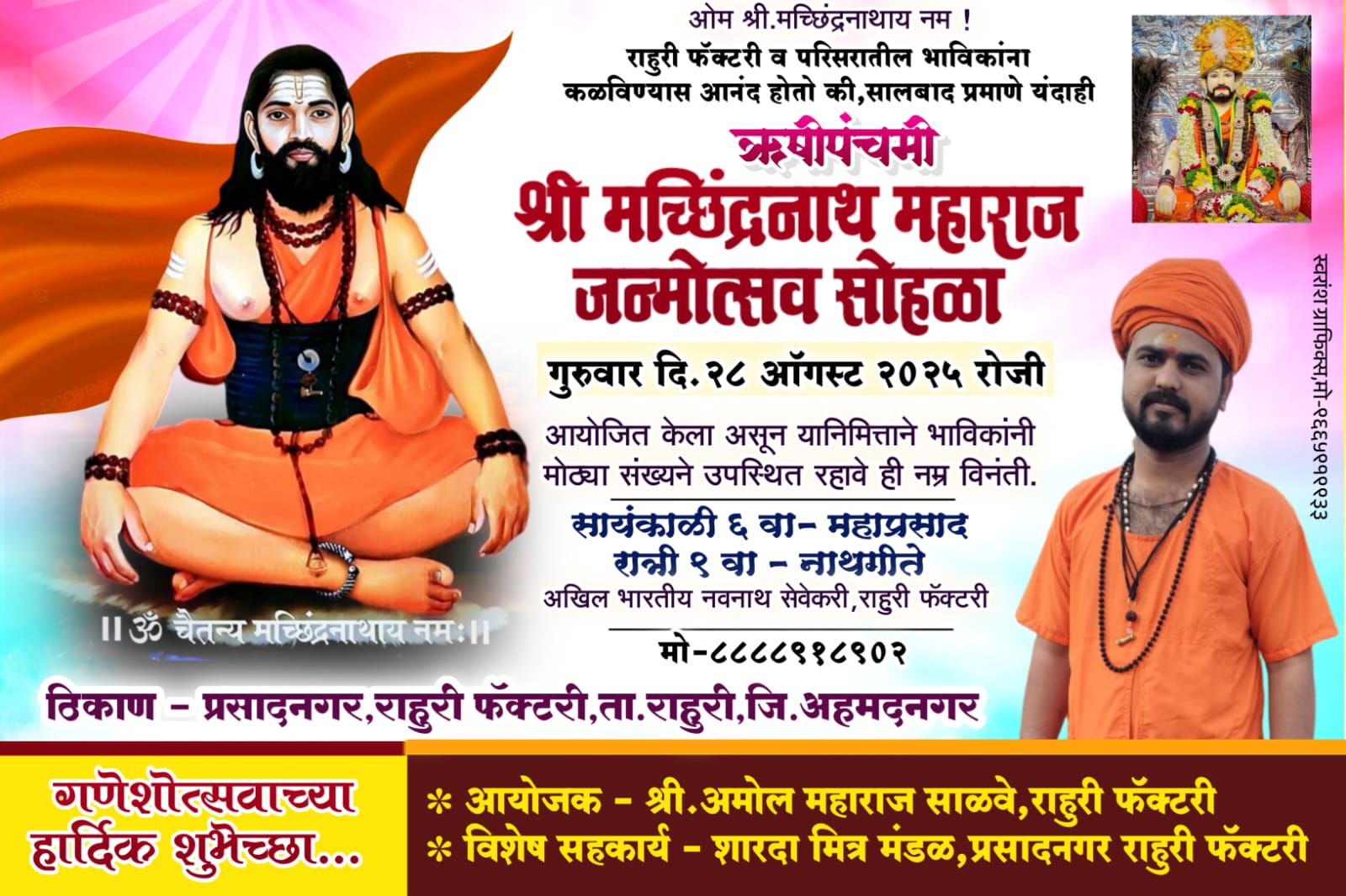राहुरी फॅक्टरी : राहुरी तालुक्यातील प्रसादनगर येथे उद्या गुरुवार दिनांक २८ ऑगस्ट रोजी ऋषीपंचमी निमित्त श्री.मच्छिंद्रनाथ महाराज जन्मोत्सव सोहळा आयोजित करण्यात येणार असल्याची माहिती अखिल भारतीय नवनाथ सेवेकरी मंडळाचे संस्थापक अध्यक्ष गुरुवर्य अमोल महाराज साळवे यांनी दिली आहे. अखिल भारतीय नवनाथ सेवेकरी मंडळाचे संस्थापक अध्यक्ष गुरुवर्य अमोल महाराज साळवे यांच्या मार्गदर्शनाखाली प्रत्येक वर्षी श्री.मच्छिंद्रनाथ महाराज जन्मोत्सव सोहळा मोठ्या भक्तिभावाने साजरा करण्यात येतो.सालाबाद प्रमाणे या ही वर्षी गुरुवार दिनांक २८ ऑगस्ट रोजी सायंकाळी ६ वाजता उपस्थित भाविक भक्तांसाठी महाप्रसाद व रात्री ९ वाजता नाथगीतांच्या कार्यक्रमाचे आयोजन करण्यात आले आहे.