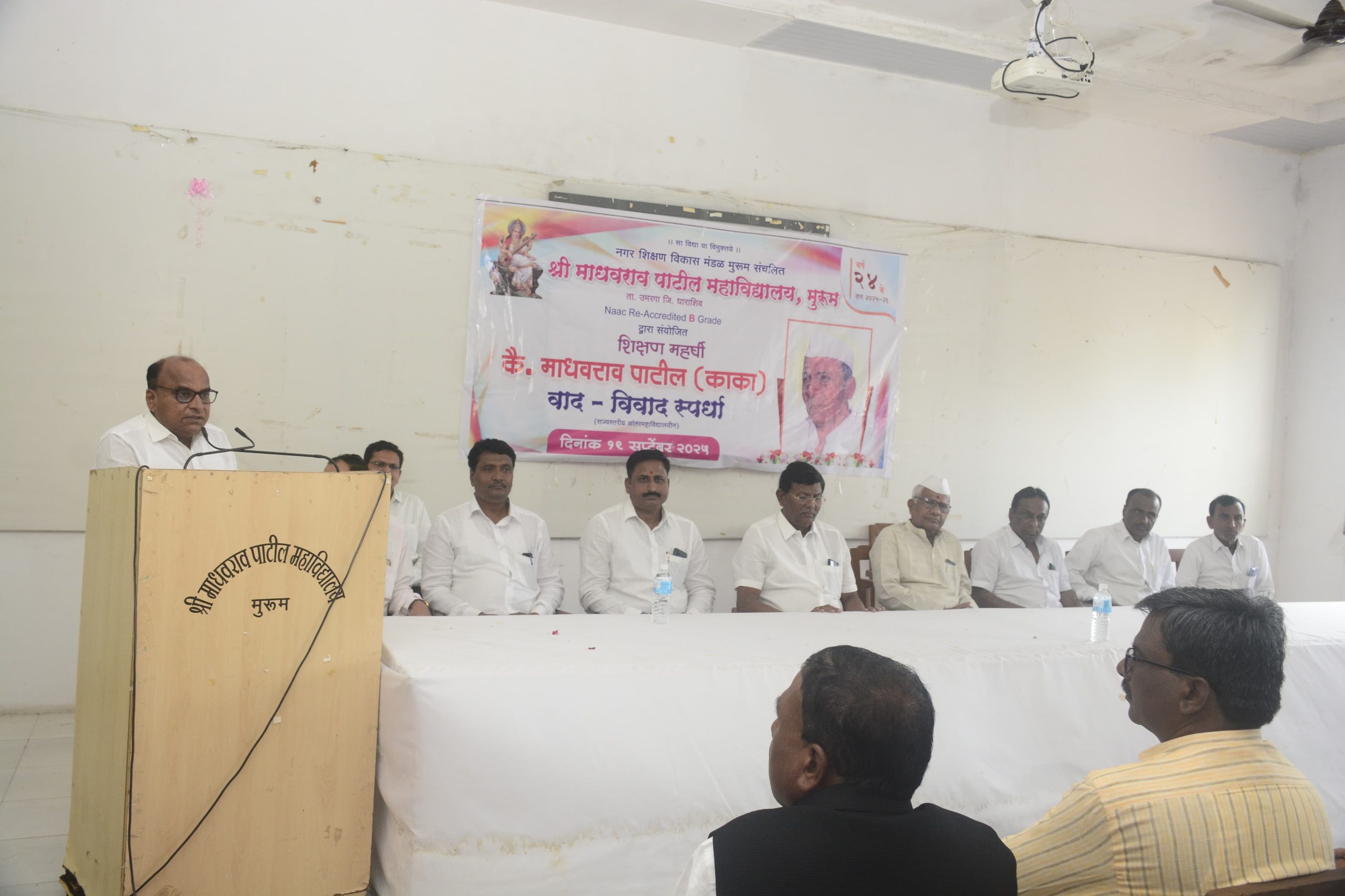 मुरुम प्रतिनिधी, (धाराशिव) : नगर शिक्षण विकास मंडळ संचलित श्री माधवराव पाटील महाविद्यालयाच्या वतीने आयोजित सांस्कृतिक सभागृहात शिक्षणमहर्षी कै. माधवराव (काका) पाटील यांच्या नावाने दरवर्षी राज्यस्तरीय आंतरमहाविद्यालयीन स्पर्धेचे आयोजन शुक्रवारी (ता. १९) रोजी करण्यात आले. हे यंदाचे २४ वे वर्ष आहे. यावेळी स्पर्धेचे उद्धाटक जिल्हा बँकेचे अध्यक्ष बापूराव पाटील यांच्या हस्ते उद्घाटन करण्यात आले.