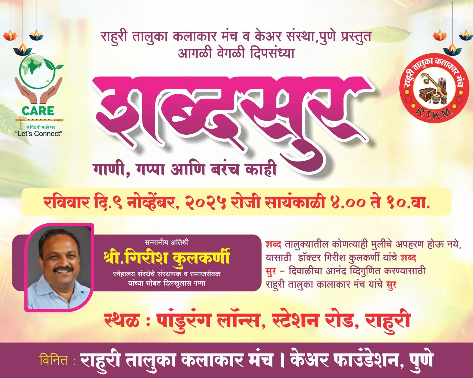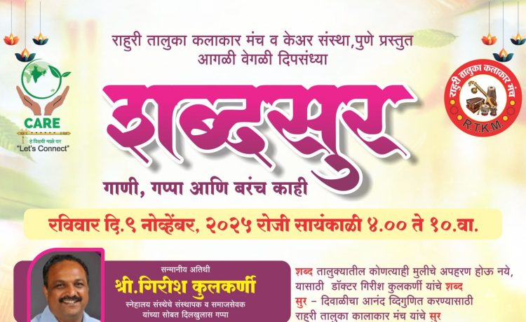 राहुरी प्रतिनिधी (सोमनाथ वाघ) : राहुरी तालुका कलाकार मंच आणि केअर संस्था (पुणे) यांच्या संयुक्त विद्यमाने “गाणी, गप्पा आणि बरंच काही – शब्दसूर” हा आगळावेगळा सामाजिक आणि सांस्कृतिक कार्यक्रम आयोजित करण्यात आला आहे. हा कार्यक्रम रविवार, दि. ९ नोव्हेंबर २०२५ रोजी सायं. ४ ते रात्री १० वाजेपर्यंत पांडुरंग लॉन्स, राहुरी येथे पार पडणार असल्याची माहिती आयोजक समितीच्या वतीने देण्यात आली. या कार्यक्रमाचे उद्दिष्ट राहुरी तालुक्यातील मुलींचे अपहरण रोखणे आणि कुटुंब व्यवस्था अबाधित राखणे या सामाजिक भानाशी जोडलेले आहे. समाजात सकारात्मक विचारांचा प्रसार व्हावा आणि कलावंतांना एक व्यासपीठ मिळावे, हा यामागचा हेतू आहे.