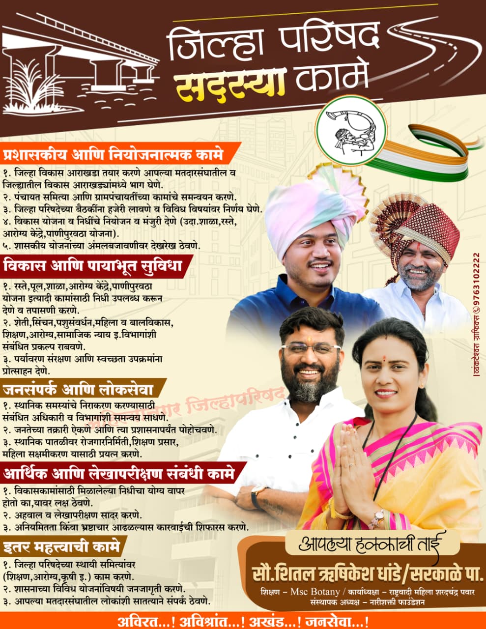 आमदार रोहित दादा पवार यांच्या एकनिष्ठ कार्यकर्त्या म्हणून शितलताई ऋषिकेश धांडे ओळखल्या जातात. आमदार रोहित दादा पवार विकासाभिमुख कार्यपद्धती आणि शितलताई ऋषिकेश धांडे जनसंपर्कशक्ती — या दोन गोष्टी ग्रामीण भागात सकारात्मक वातावरण निर्माण करत आहेत.