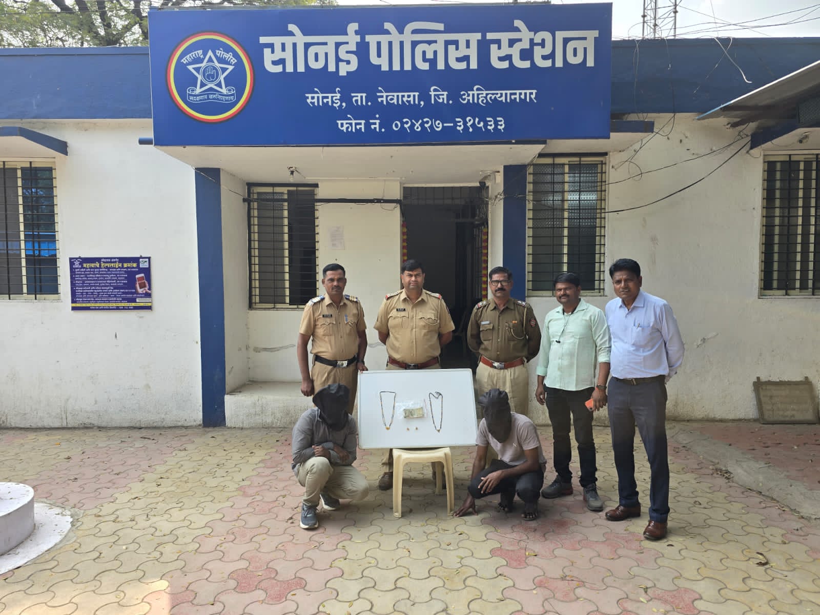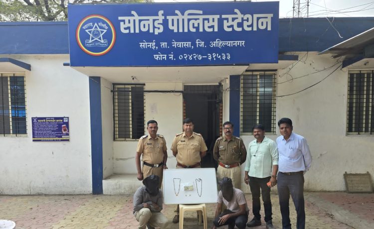 प्रतिनिधी : ज्ञानेश्वर सुरशे : सोनई (ता. नेवासा) येथील इंदिरानगर भागात भरदिवसा घरफोडी करणाऱ्या दोन सराईत चोरट्यांना सोनई पोलिसांनी अवघ्या काही दिवसांत जेरबंद केले आहे. त्यांच्याकडून चोरीला गेलेला ९० हजार रुपये किमतीचा पूर्ण मुद्देमाल हस्तगत करण्यात पोलिसांना यश आले आहे.