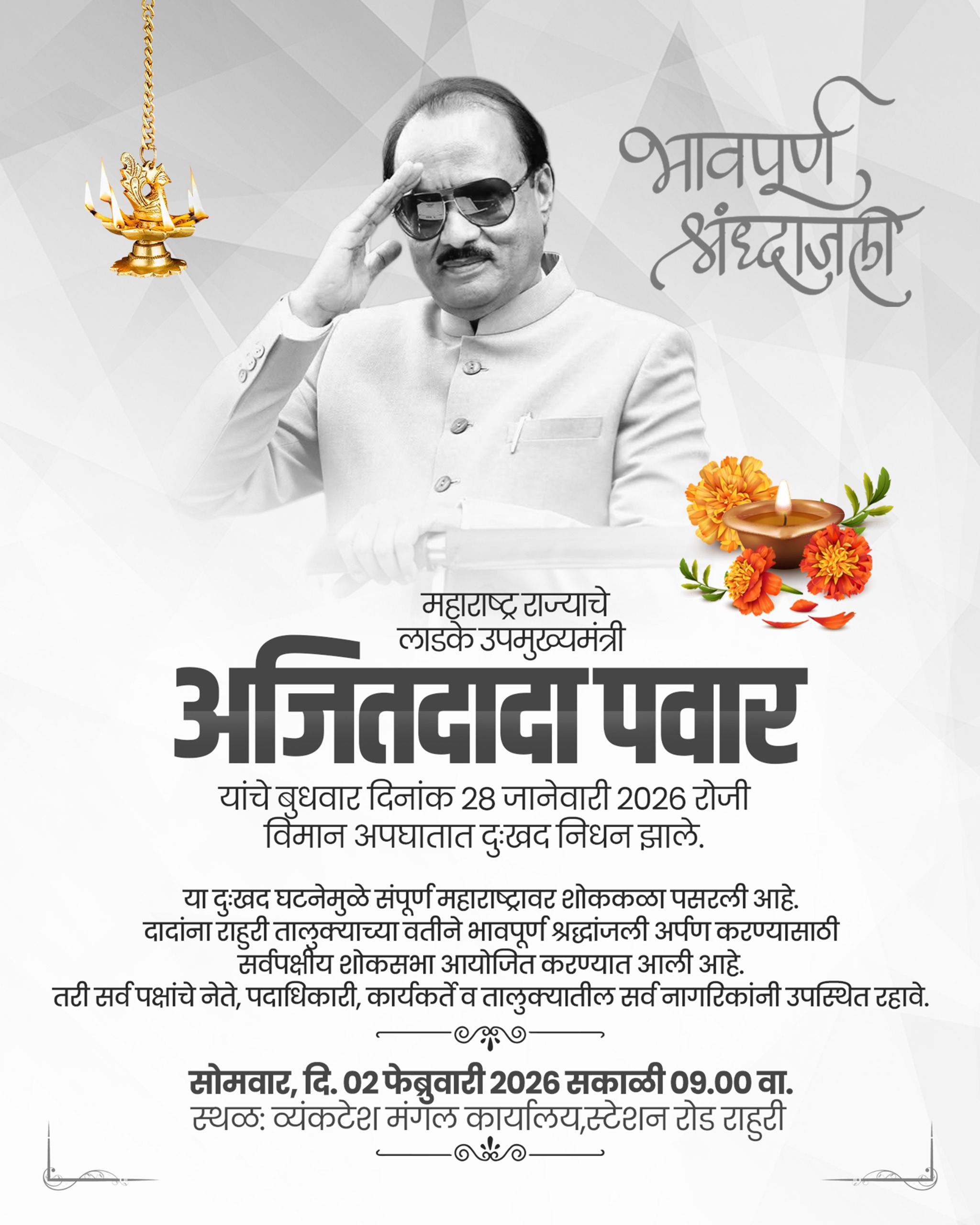 राहुरी प्रतिनिधी : महाराष्ट्र राज्याचे लाडके उपमुख्यमंत्री अजितदादा पवार यांचे बुधवार, दि. २८ जानेवारी २०२६ रोजी विमान अपघातात दुःखद निधन झाले. या हृदयद्रावक घटनेमुळे संपूर्ण महाराष्ट्रात शोककळा पसरली असून सर्वत्र हळहळ व्यक्त करण्यात येत आहे. या दुःखद घटनेच्या पार्श्वभूमीवर अजितदादा पवार यांना राहुरी तालुक्याच्या वतीने भावपूर्ण श्रद्धांजली अर्पण करण्यासाठी राहुरी तालुक्यात सर्वपक्षीय शोकसभेचे आयोजन करण्यात आले आहे. या शोकसभेमध्ये विविध राजकीय पक्षांचे नेते, पदाधिकारी, कार्यकर्ते तसेच तालुक्यातील सर्व नागरिक सहभागी होणार आहेत.
