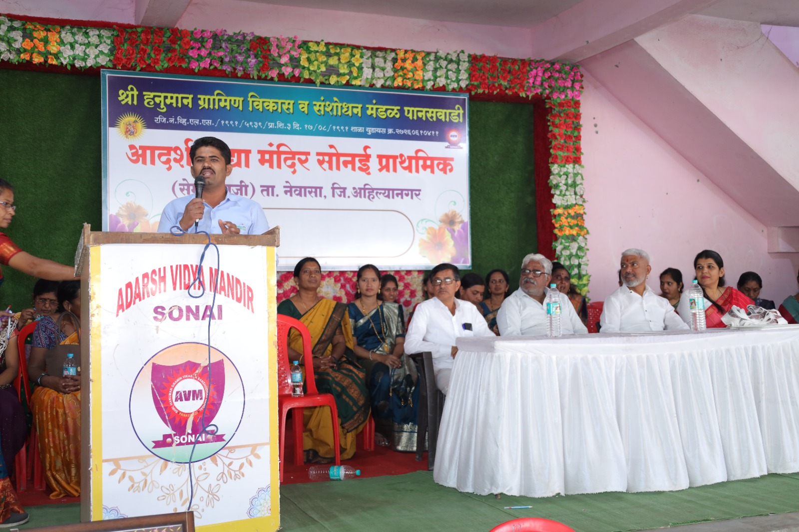 तर हिंदुस्थान फीड्स कंपनीचे एरिया सेल्स मॅनेजर श्री. पांडुरंग सातपुते , सेल्स ऑफिसर नरसिंह कुलाडे, ग्राहक सेवा अधिकारी किरण गायकवाड यांच्या प्रमुख उपस्थीत कार्यक्रम संपन्न झाला आहे. प्रास्ताविक भाषणात मुख्याध्यापक श्री अनिल दरंदले यांनी संस्थेचे अध्यक्ष जयश्रीताई गडाख व सचिव रविराज गडाख यांच्या मार्गदर्शनाखाली शाळेतील वर्षभरात राबविण्यात येणाऱ्या उपक्रमाची आदर्शयुक्त माहिती दिली.कार्यक्रम प्रसंगी पांडुरंग सातपुते यांनी “गाय व माय” याबद्दल माहिती देताना म्हणाले,गाय आपण चांगला चारा व खाद्य म्हणजे हिंदुस्थान फिडस ची कांडी वापरावी म्हणजे गाय चांगले दूध देईल,म्हणजे माय व मुलगा यांचे आरोग्य चांगले राहील.