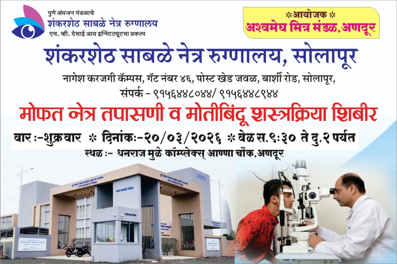 तुळजापूर प्रतिनिधी / चंद्रकांत हगलगुंडे : तुळजापूर तालुक्यातील अणदूर येथे उद्या शुक्रवार (दि. २० मार्च) रोजी भव्य मोफत नेत्र तपासणी व मोतीबिंदू शस्त्रक्रिया शिबिराचे आयोजन करण्यात आले आहे. आश्वमेघ मित्र मंडळ, अणदूर व सोलापूर येथील शंकरशेठ साबळे नेत्र रुग्णालय यांच्या संयुक्त विद्यमाने हा उपक्रम राबविण्यात येत असून, परिसरातील गरजू नागरिकांनी या संधीचा लाभ घ्यावा, असे आवाहन आयोजकांनी केले आहे.