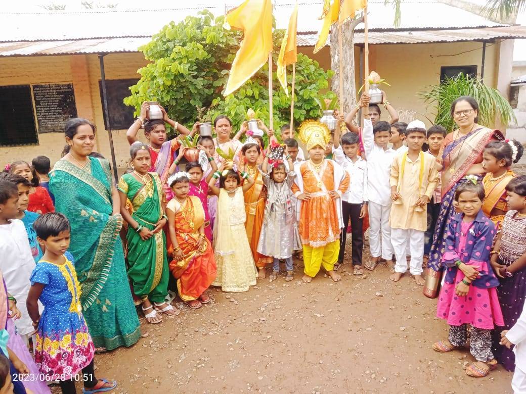 राहुरी प्रतिनिधी / ज्ञानेश्वर सुरशे : राहुरी तालुक्यातील जि. प. प्रा. शाळा गोटुंबे आखाडा येथील शाळेत आषाढी एकादशीच्या औचित्य साधून भव्य बालदिंडी सोहळ्याचे आयोजन दि.28 जून रोजी करण्यात आले होते. या बाल दिंडी सोहळ्यात शाळेतील लहान मोठ्या सर्व बालकांनी वारकऱ्यांची तसेच विट्ठल रखुमाईसह वेगवेगळी वेशभूषा परिधान करून विद्यार्थ्यांनी शिक्षिकांसमवेत गोटूंबे आखाडा गावातून भव्य पायी दिंडी सोहळा मिरवणूक काढण्यात आली होती. यावेळी विद्यार्थ्यांनी टाळ मृदंगाच्या गजरात आणि विठू माऊलीच्या नामघोषाचा गजर करून बालदिंडीचा आनंद लुटला तसेच रिंगणात बाल वारकऱ्यांनी ग्यानबा तुकाराम असा जयघोष करून फुगड्या खेळण्याचा आनंद लुटला. मुलांच्या या आनंदात ग्रामस्थ पुरुष व महिला वारकरी मोठ्या प्रमाणात सहभागी झाले होते.