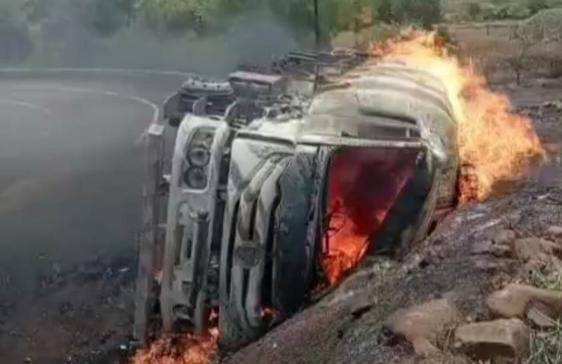जखमींवर पाथर्डी येथील उपजिल्हा रुग्णालयात उपचार करण्यात आले. गणेश रामराव पालवे (वय ४२, रा. पालेवाडी), सुरैया बशीर शेख (वय ४६, रा. माळी बाभूळगाव, ता.पाथर्डी) असे दोन जण आगीत जळून मृत झाले आहेत. लहू सांडू पवार (वय ५३), सुमन लहू पवार (वय ४९), जगदीश जगन पवार (वय ३), कोमल जगन पवार (वय ७, रा. विसरवाडी, ता. पैठण), टँकरचा मुख्य चालक दादासाहेब केकाण ( रा.पालवेवाडी) असे जखमींची नावे आहेत. गणेश पालवे हा या टँकरचा दुसरा चालक टँकरच्या डाव्या बाजूला बसलेला होता. त्याच बाजूने टँकर उलटल्याने तो टँकर खाली सापडला. त्यामुळे तो आगीमध्ये जळून खाक झाला.