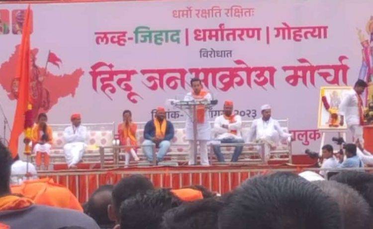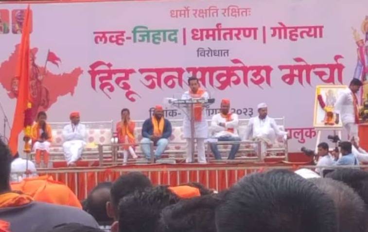 यावेळी व्यासपिठावरील आ. नितेश राणे, श्रीसंत तुकाराम महाराजांचे वंशज मोरे महाराज, हर्षदा ठाकूर, एकलव्य संघटनेचे योगेश सुर्यवंशी, श्रीराम सेनेचे सागर बेग यांनी आपल्या भाषणातून घटनेचा चांगला खरपूस समाचार घेतला. नितेश राणे बोलताना म्हणाले, देशाच्या इतिहासात हिंदूंनी कधीच प्रथम दंगल घडविली नसून हिंदू समाज कधीच कुण्याच्या अंगावर जात नाही. डॉ.बाबासाहेब आंबेडकरांनी दिलेल्या सविधानाचे कायद्यांचे पालन करतो. हिंदूकडून अन्य धर्माच्या लोकांना कधीच त्रास होत नाही. प्रत्येकाने आपला धर्म संभाळावा व आम्हाला हिंदू म्हणून या देशात सुखाने जगू द्यावे.