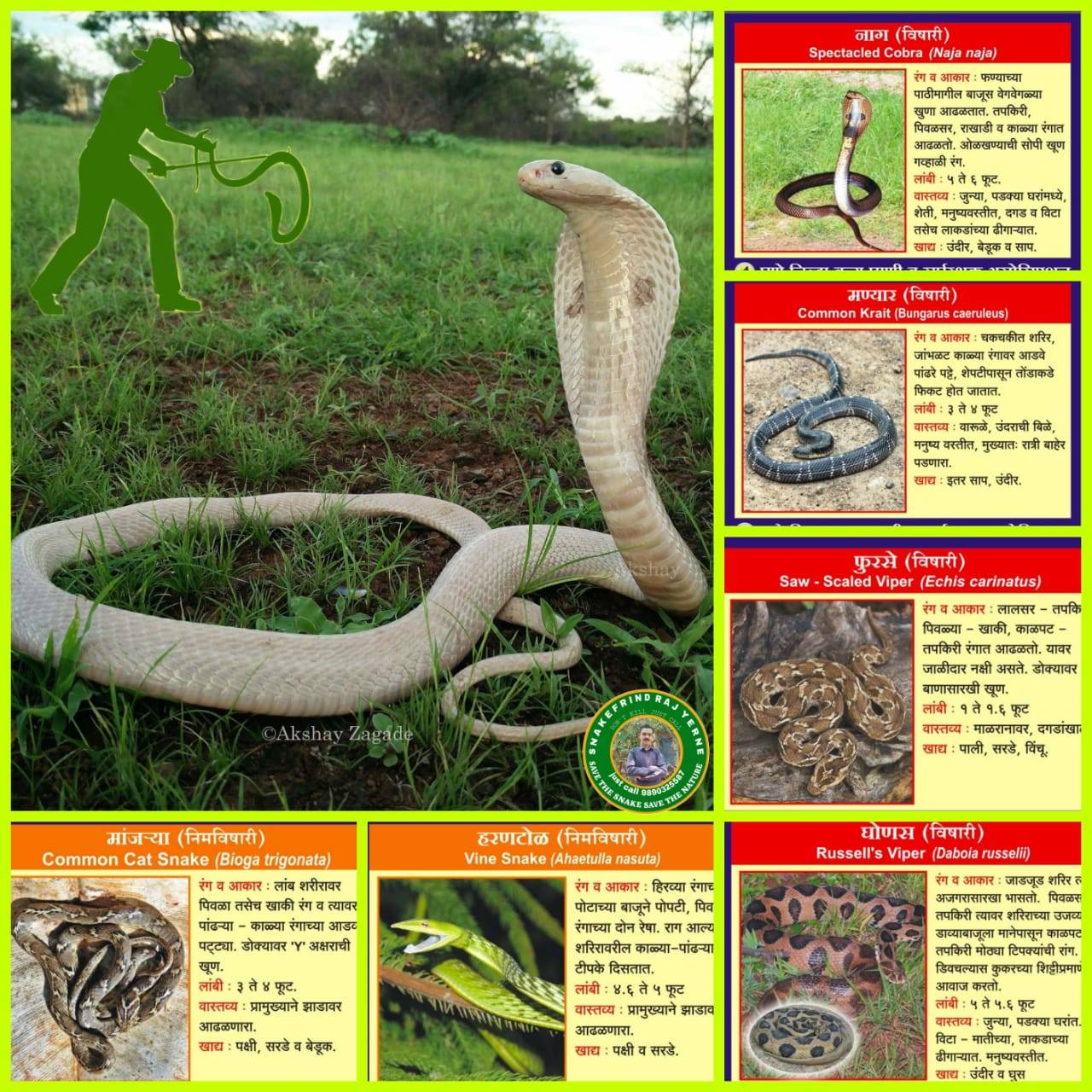 जगामध्ये सुमारे 2700 प्रकारचे साप आढळतात. भारतात त्यापैकी 278 जाती सापडतात..त्यात काही विषारी आहेत, काही सौम्य विषारी; तर बहुसंख्य बिनविषारी आहेत. आपण एकदा जर हे विषारी साप ओळखायला शिकलो आणि स्वतः त्यांच्यापासून सुरक्षित अंतरावर राहिलो तर स्वतःला सहज वाचवता येतं..