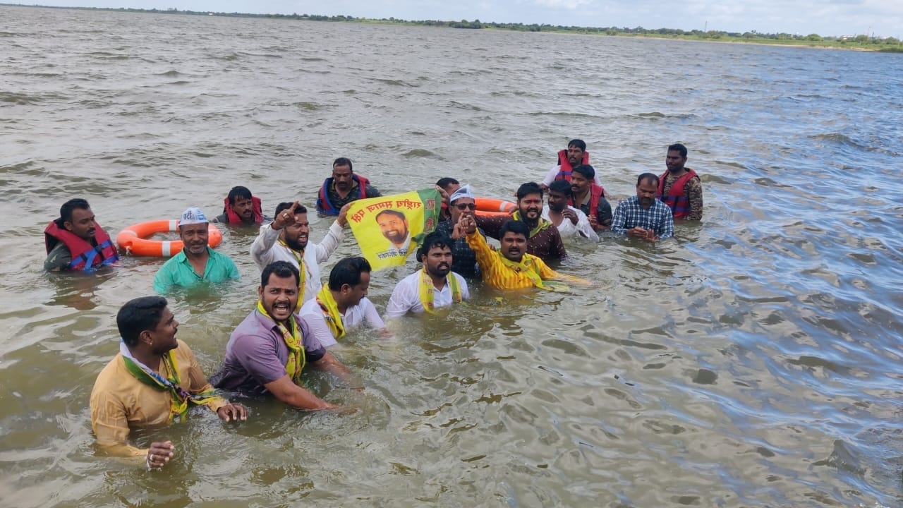 धाराशिव प्रतिनिधी / विजय कानडे : धाराशिव तालुक्यातील तेर येथे ता.२६ रोजी राष्ट्रीय समाज पक्ष व आम आदमी पार्टी तर्फे तेर, ढोकी, येडशी, तडवळा या चार गावची पाणीपुरवठा योजना सुरळीत करण्यासाठी तेरणा धरण तेर येथे जलसमाधी आंदोलन केले. ता. १ ऑगस्ट रोजी जिल्हाधिकारी कार्यालय येथे चारगाव पाणीपुरवठा योजना चालू करा अन्यथा जलसमाधी आंदोलन करणार असा इशारा देऊन देखील जिल्हा प्रशासनाने कुठलीही दखल न घेतल्यामुळे आज जलसमाधी आंदोलन केले.