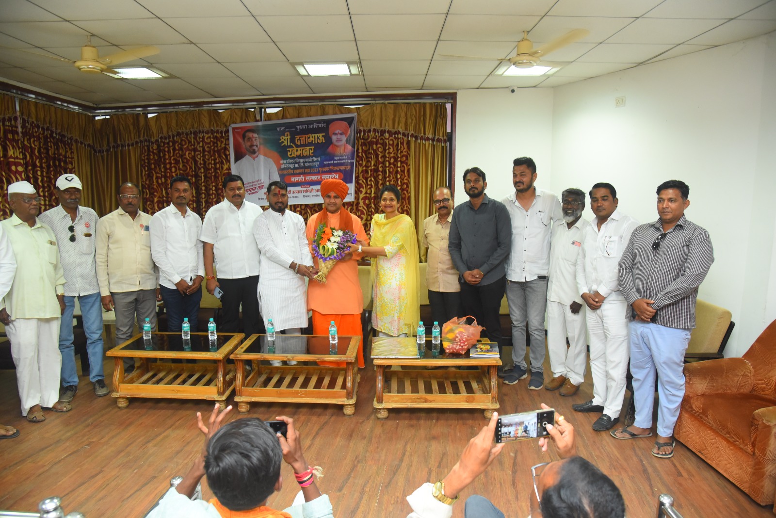 या कार्यक्रमासाठी प्रमुख उपस्थिती म्हणून स्वामी अरुण नाथगिरी महाराज उपस्थित होते यावेळी उपस्थित मान्यवर यांनी दत्तात्रय खेमनर यांना हवामान तज्ञ पुरस्कार मिळाल्याबद्दल त्यांना श्रीरामाची शॉल गुलाबाचा हार घालून भव्य असा सत्कार केला यावेळी स्वामी अरुणा थ गिरी महाराज यांनी दत्तात्रय खेमनर हे लवकरच महाराष्ट्रातील एक प्रसिद्ध हवामान तज्ञ म्हणून नावारूपाला येथील असा माझा आशीर्वाद आहे असे बोले यावेळी नगराध्यक्ष अनुराधाताई आदिक त्यांनी देखील आपल्या भाषणामध्ये दत्तात्रय खेमनर हे श्रीरामपूर चे नाव संपूर्ण महाराष्ट्रामध्ये हवामान तज्ञ म्हणून पोहोचवत आहे भाजपाचे प्रदेश प्रवक्ते नितीन जी दिनकर यांनी दत्ताभाऊ खेमनर यांच्या हवामानाचा अंदाज कसे खरे ठरले याचे अनुभव सांगितले.