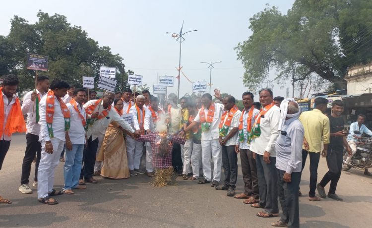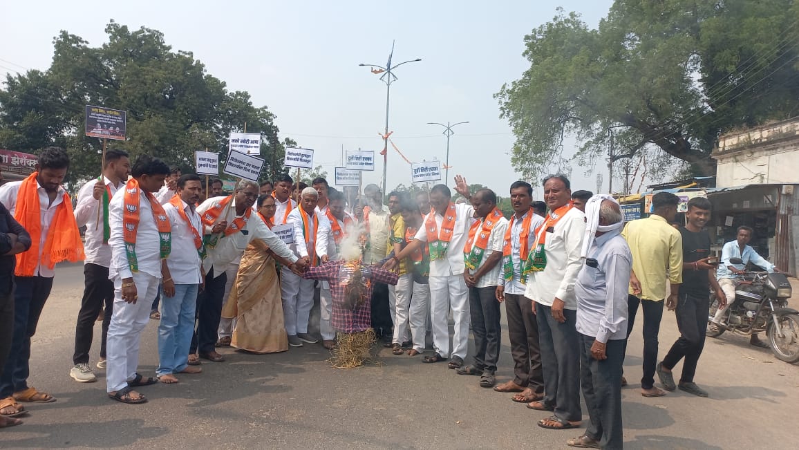 बिलोली प्रतिनिधी / साईनाथ गुडमलवार : बिलोली येथे भाजपाच्या वतीने,भाजपा युवा मोर्चा, महीला मोर्चा व सेलच्या वतिने महाविकास आघाडी चा निषेध करत पुतळा जाळण्यात आला कंत्राटी नोकर भरतीचा जी आर स्वतः काढून उपमुख्यमंत्री व मुख्यमंत्री महायुतीवर खापर फोडण्यात येत असल्यामुळे शहरातील तहसील कार्यालया समोर राष्ट्रवादी काँग्रेसचे अध्यक्ष शरद पवार माजी मुख्यमंत्री उद्धव ठाकरे, पृथ्वीराज चव्हाण यांच्या विरोधात घोषणाबाजी करत महाविकास आघाडी नेत्यांचा पुतळा जाळण्यात आला. राज्य शासनाने नुकतीच विविध विभागांत कंत्राटी नोकर भरतीचा जीआर काढला होता त्यामुळे संपूर्ण राज्यात महायुती सरकार व देवेंद्र फडणवीस यांच्यावर टीका केली जात होती याचा भाजपाकडून निषेध नोंदवला व माजी मुख्यमंत्री उद्धव ठाकरे पृथ्वीराज चव्हाण, काँग्रेस प्रदेशाध्यक्ष नाना पटोले यांचा संयुक्त पुतळा जाळून त्यांच्या विरोधात घोषणाबाजी करण्यात आली.