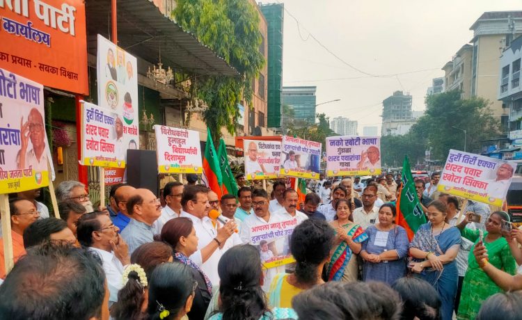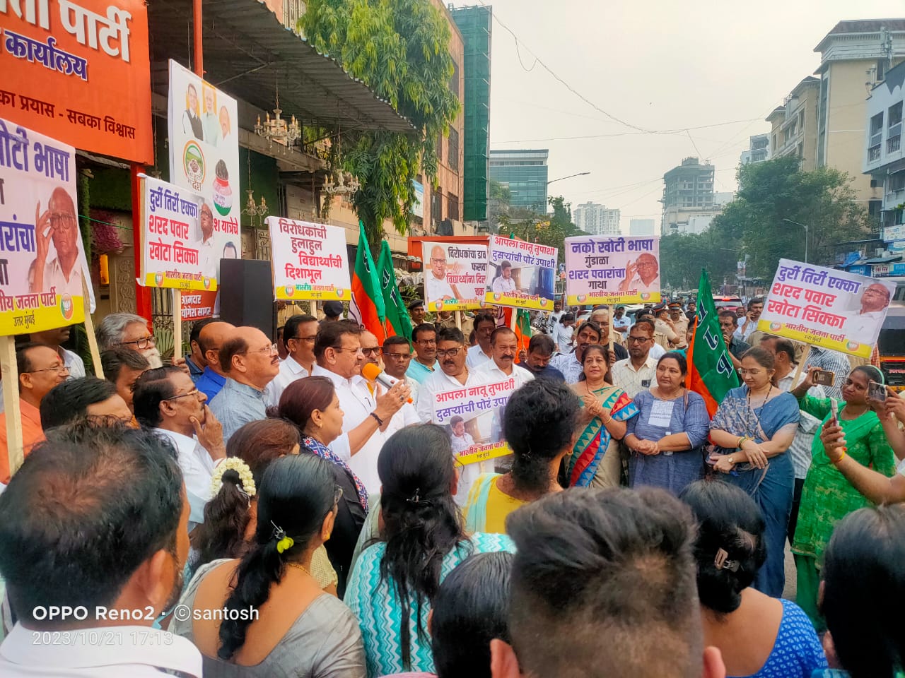 मुंबई कांदिवली / भारत कवितके : कांदिवलीमध्ये शनिवार दिनांक 21 आक्टोंबर 2023रोजी दुपारी 4 वाजता एस.व्ही.रोड, भाजपा उत्तर मुंबई जिल्हा कार्यालयाच्या समोर कांदिवली चारकोप विधानसभा आमदार योगेश सागर यांच्या नेतृत्वाखाली महाआघाडी विरोधात निषेध मोर्चा चे आयोजन करण्यात आले होते.कंत्राटी कामगार भरती चे पाप हे महाआघाडीच्या नेत्यांचेच आहे.या बाबत लोकनेते देवेंद्र फडणवीस यांनी महाआघाडीच्या नेत्यांचा पर्दाफाश केला.आपला नातू तुपाशी,दुसर्याचे पोरं उपाशी. विरोधकांचा डाव फसवा, विद्यार्थ्यांना दिला चकवा.विरोधकांची हुलाहुल, विद्यार्थी दिशाभूल,दुरी तिरी एक्का शरद पवार खोटा सिक्का,अशा आशयाचे फलक व घोषणाबाजी सुरू करून परीसर दणाणून गेला होता.तर देवेंद्र फडणवीस संघर्ष करो, महाराष्ट्र आप के साथ है,