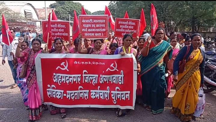 यासह विविध प्रलंबित मागण्यासाठी राज्यभरातील आंदोलन सुरू केले आहे. यामुळे अंगणवाडीतील बालकांना मिळणाऱ्या पोषण आहारावर परिणाम झाला आहे. या आंदोलनादरम्यान आज राहुरी तहसील कार्यालयावर शेकडो अंगणवाडी सेविका आणि मदतनीस यांनी मोर्चा काढत सरकार विरोधात आठ दिवसापासून काम बंद जोरदार घोषणाबाजी केली. अंगणवाडी सेविकांनी गेल्या सेविका – मदतनीस कर्मचारी युनियन अधिवेशन सुरू असतानाही सरकार अंगणवाडी सेविकांच्या मागण्या बाबत तोच भूमिका घेत नसल्याने 15 डिसेंबरला राज्यभरातल्या अंगणवाडी सेविका नागपूर येथे निदर्शने करणार आहेत. त्यानंतर ही प्रश्न मार्गी न लागल्यास मंत्र्यांना विरोध करण्यासह तीव्र आंदोलन करण्याचा इशारा दिला.