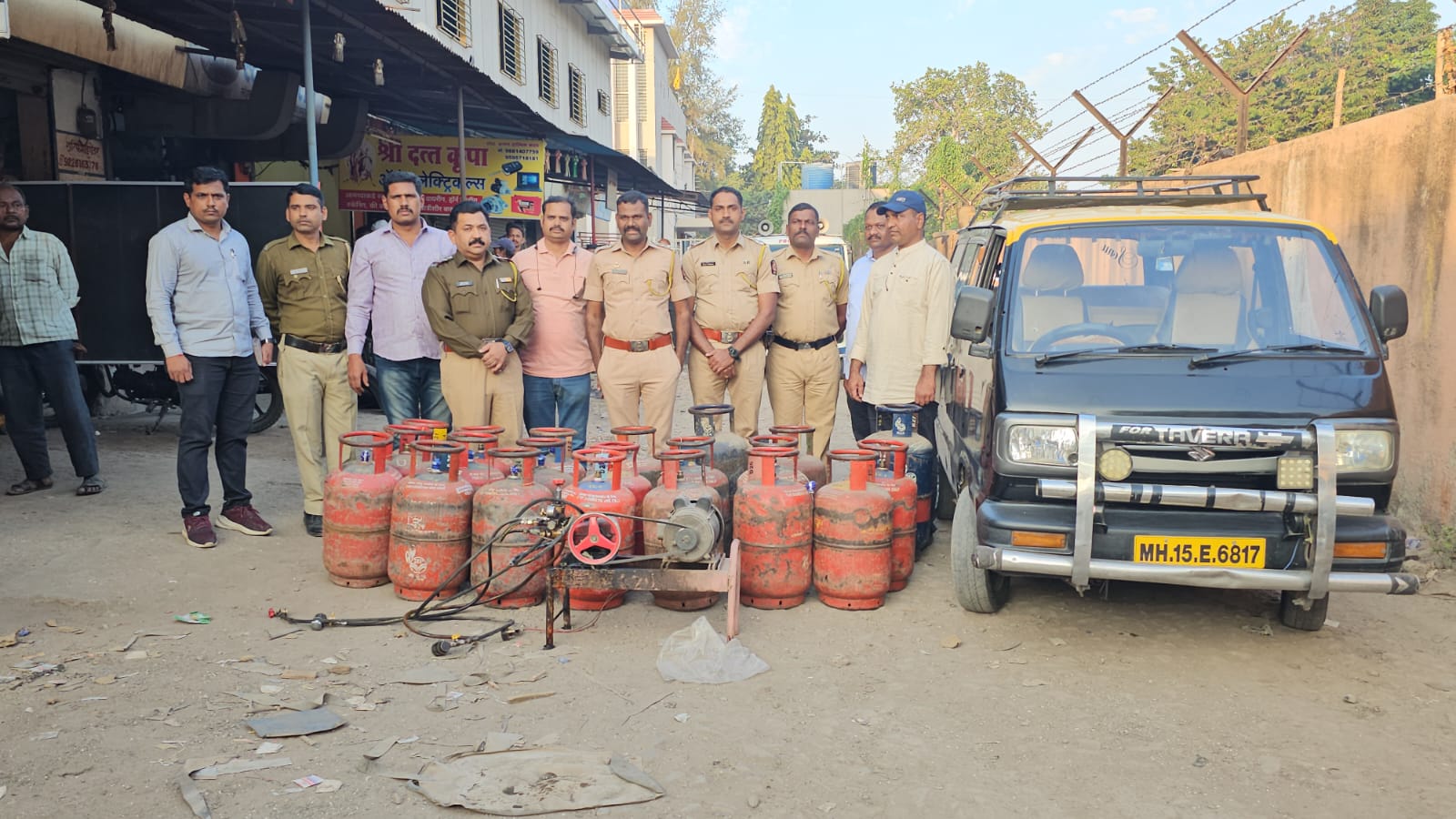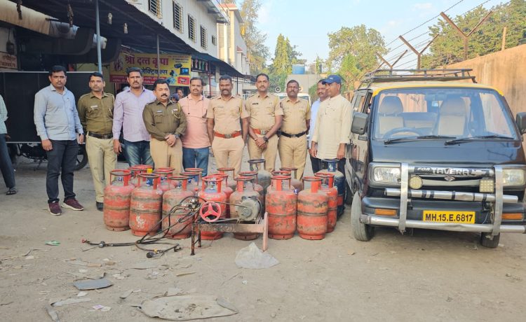 विशेष प्रतिनिधी / इनायत अत्तार : शनिवार दि. 30/12/2023 रोजी डी.वाय.एस.पी. संदीप मिटके यांना गुप्त बातमी धारामार्फत माहिती मिळाली की कोपरगाव येथील साई कॉर्नर जवळ नगरपालिकेच्या गाळ्यामध्ये साईगंगा मोटर गॅरेज मध्ये मनोज गिरमे हा इसम चार चाकी वाहनांमध्ये अवैध गॅस सिलेंडर रिफिलिंग करत आहे. अशी खात्रीशीर माहिती मिळाल्याने कोपरगाव येथील तहसीलदार यांना कळवून संयुक्त कारवाई करण्याकरिता माहिती दिली असता त्यांनी तहसील कार्यालय येथील पुरवठा निरीक्षक महादेव कुंभारे यांना संयुक्त कारवाई करण्याकरता पाठवले त्यावर सदर ठिकाणी पथकातील पोलीस अमलदार पाठवुन पंचासमक्ष छापा टाकुन दोन चार चाकी वाहनांसह गॅस सिलेंडर भरण्याचे रिफिलिंग मशीन व 19 घरगुती गॅस टाक्या तसेच 2 कमर्शियल गॅस टाक्या जप्त करण्यात आले आहेत तसेच 1) मनोज चंद्रकांत गिरमे वय 43 रा. खडकी रोड तालुका कोपरगाव 2) अल्ताफ बाबू शेख – वय 48 रा. मनमाड ता. नांदगाव जि. नाशिक या आरोपिंना ताब्यात घेण्यात आले.