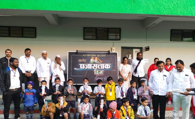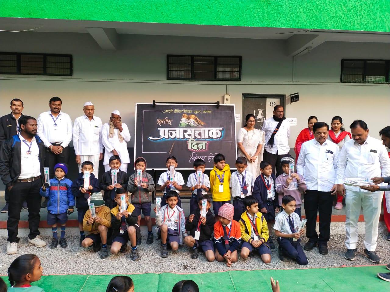 प्रतिनिधी / विठ्ठल ठोंबरे : म.वि.प्र संचलित आदर्श इंग्लिश मेडियम स्कूल सटाणा येथे 75 वा प्रजासत्ताक दिन उत्साहात साजरा करण्यात आला. या कार्यक्रमाचे अध्यक्षस्थानी शालेय समितीचे अध्यक्ष मा.श्री. सुनिल दादा सोनवणे हे होते. यावेळी व्यासपीठावर स्कूल कमिटीचे सर्व सदस्य श्री.माधवराव सोनवणे, श्री.बाजीराव सोनवणे, श्री.संजय पवार, श्री.किरण सोनवणे, श्री. सागर अहिरे, पालक, शाळेच्या मुख्याध्यापिका श्रीम.वैशाली सोनवणे, श्रीम.अश्विनी महाले, श्रीम. सारिका कदम, श्री.विनय सोनवणे आदी मान्यवर उपस्थित होते.