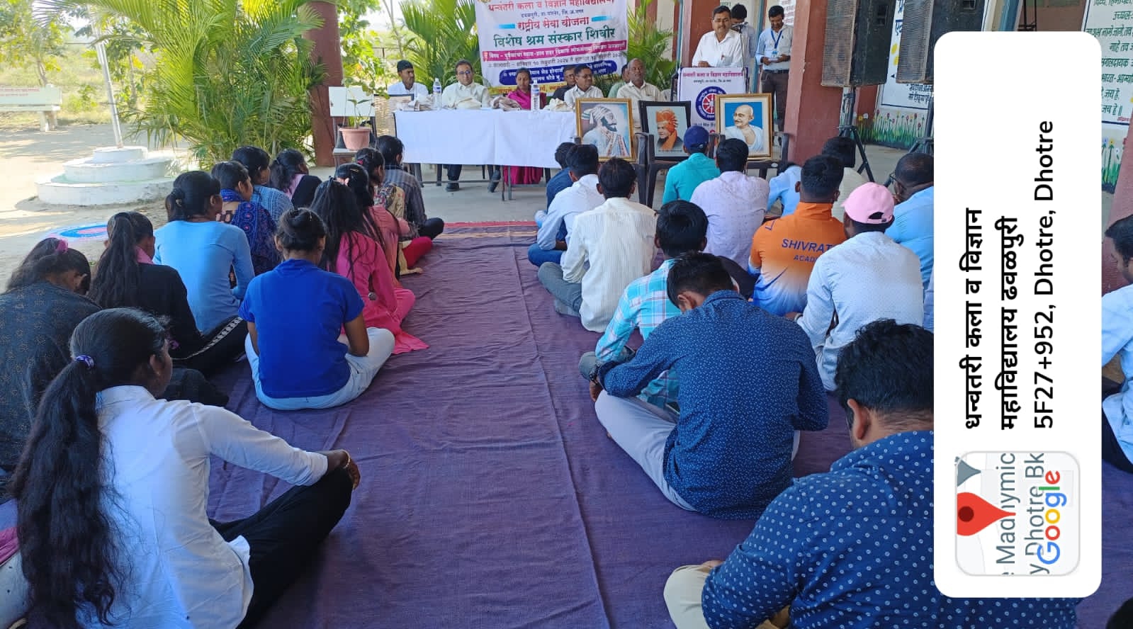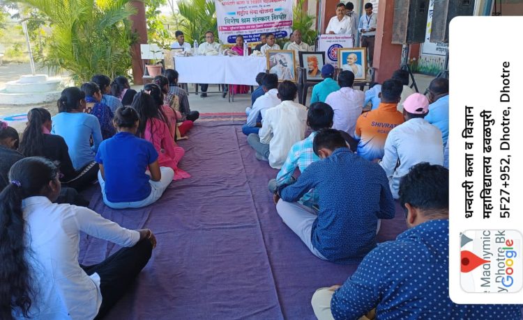 प्रतिनिधी / गंगासागर पोकळे : पारनेर तालुक्यातील ढवळपुरी येथील धन्वंतरी कला व विज्ञान महाविद्यालयाचे श्रमसंस्कार शिबिराचे आज धोत्रे बुद्रुक, तालुका पारनेर येथे उद्घाटन संपन्न झाले. या उद्घाटन प्रसंगी संस्थेचे सचिव रेहान जी काझी , उद्घाटन अध्यक्ष मा. वनिताताई चंद्रकांत कसबे (सरपंच धोत्रे) , माननीय सौ.रोशनीताई राजू रोडे (उपसरपंच धोत्रे), सर्व ग्रामपंचायत सदस्य धोत्रे बुद्रुक, श्री.अशोक देवराम जाधव (मुख्याध्यापक श्रीमान शेठ होनाजी कोंडाजी ढोमे माध्यमिक विद्यालय, धोत्रे) मान.सासवडे गुरुजी, श्री बापूसाहेब रुपनर सर (मुख्याध्यापक माध्य.आश्रम शाळा ,ढवळपुरी) संदीप महांडुळे सर( मुख्याध्यापक. प्राथ. आश्रम शाळा, ढवळपुरी) , कार्यक्रम अधिकारी प्राध्यापक जमील शेख सर उपस्थित होते.